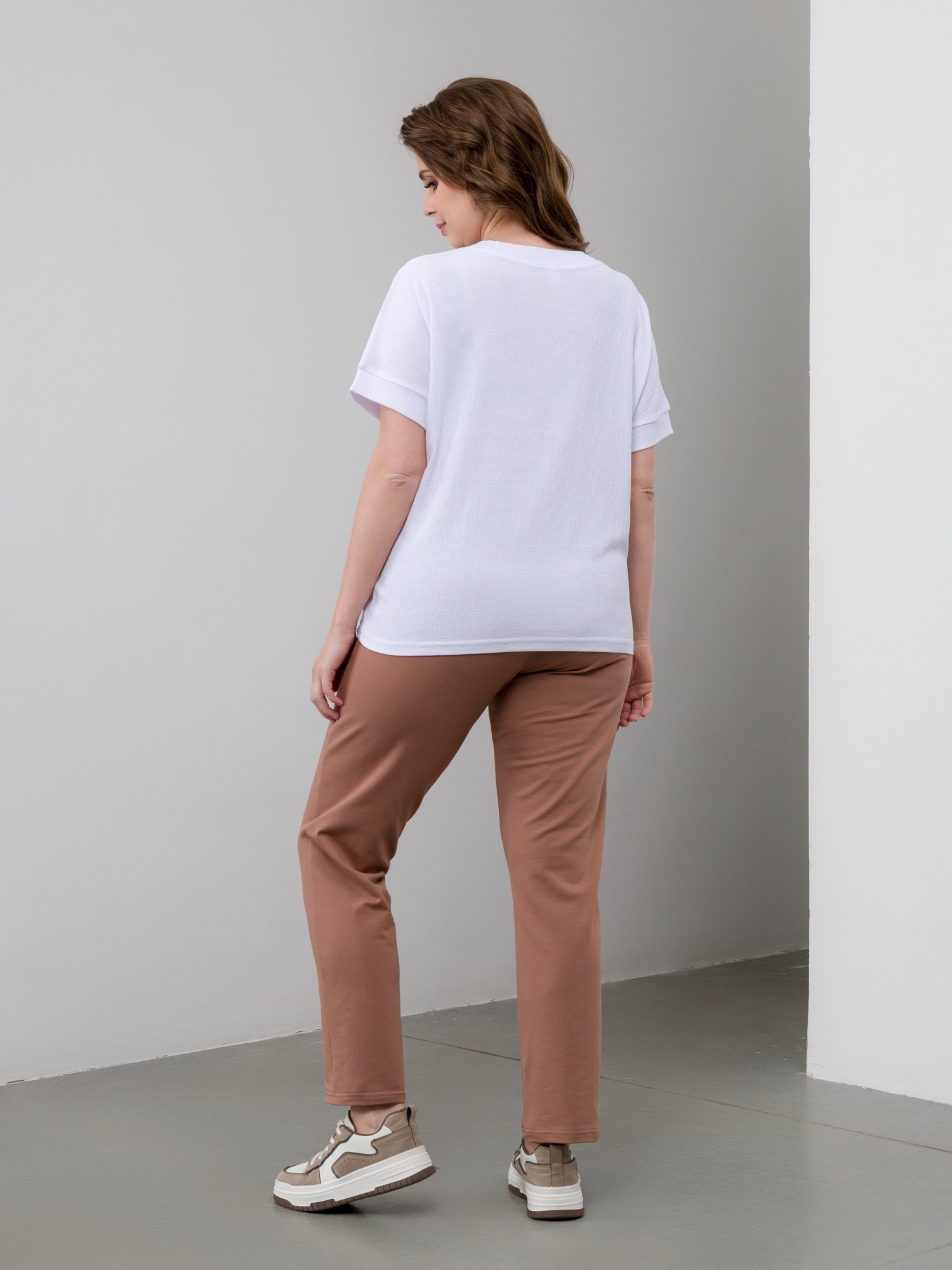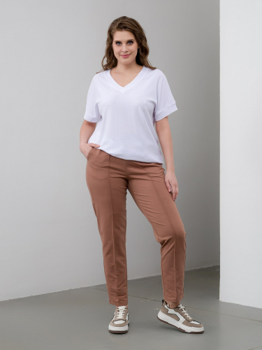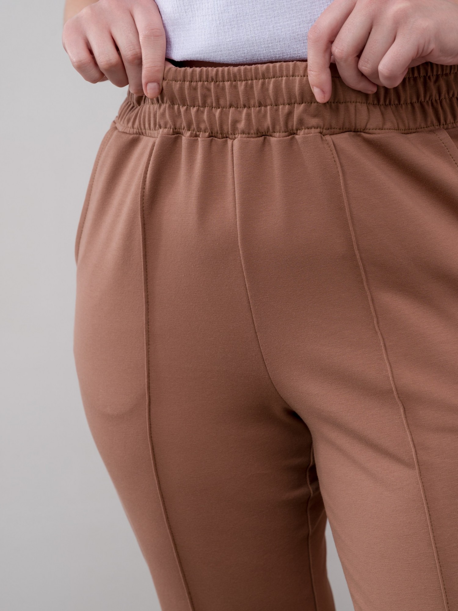 Брюки женские из трикотажного полотна «футер-двунитка», длинные, полуприлегающего силуэта, на притачном поясе с эластичной тесьмой внутри и карманами в боковых швах. Передние половины застрочены по центральным линиям, на задних половинах обработаны две вытачки в области талии.
