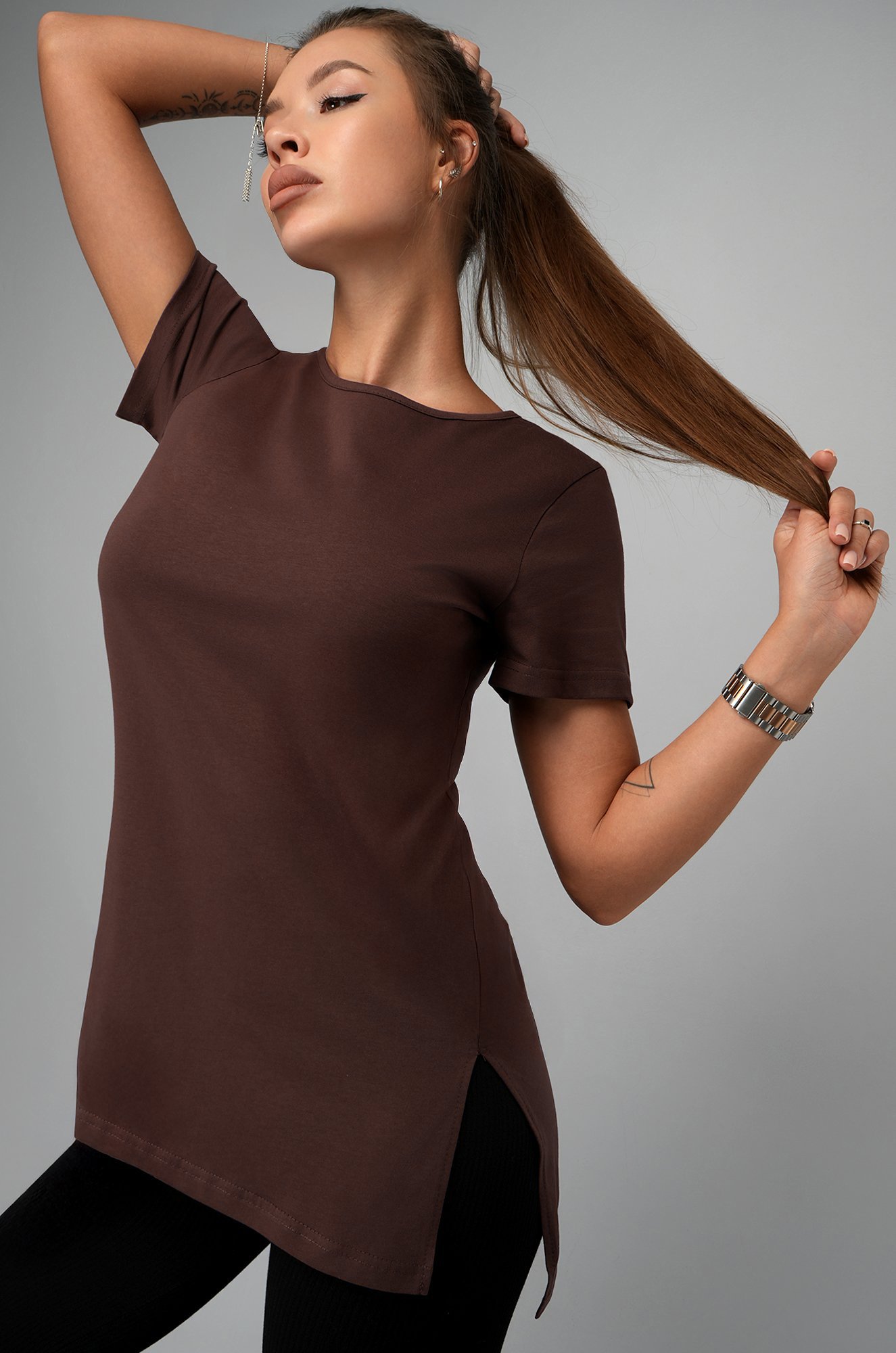 Женская футболка туника шоколадного цвета — универсальная модель, в которой легко быть собой. Длинный слегка приталенный крой подчеркивает фигуру, а мягкий хлопковый трикотаж делает её идеальным выбором на каждый день. Удлиненная футболка создана для тех, кто ценит комфорт, естественность и спокойную эстетику без лишних деталей.