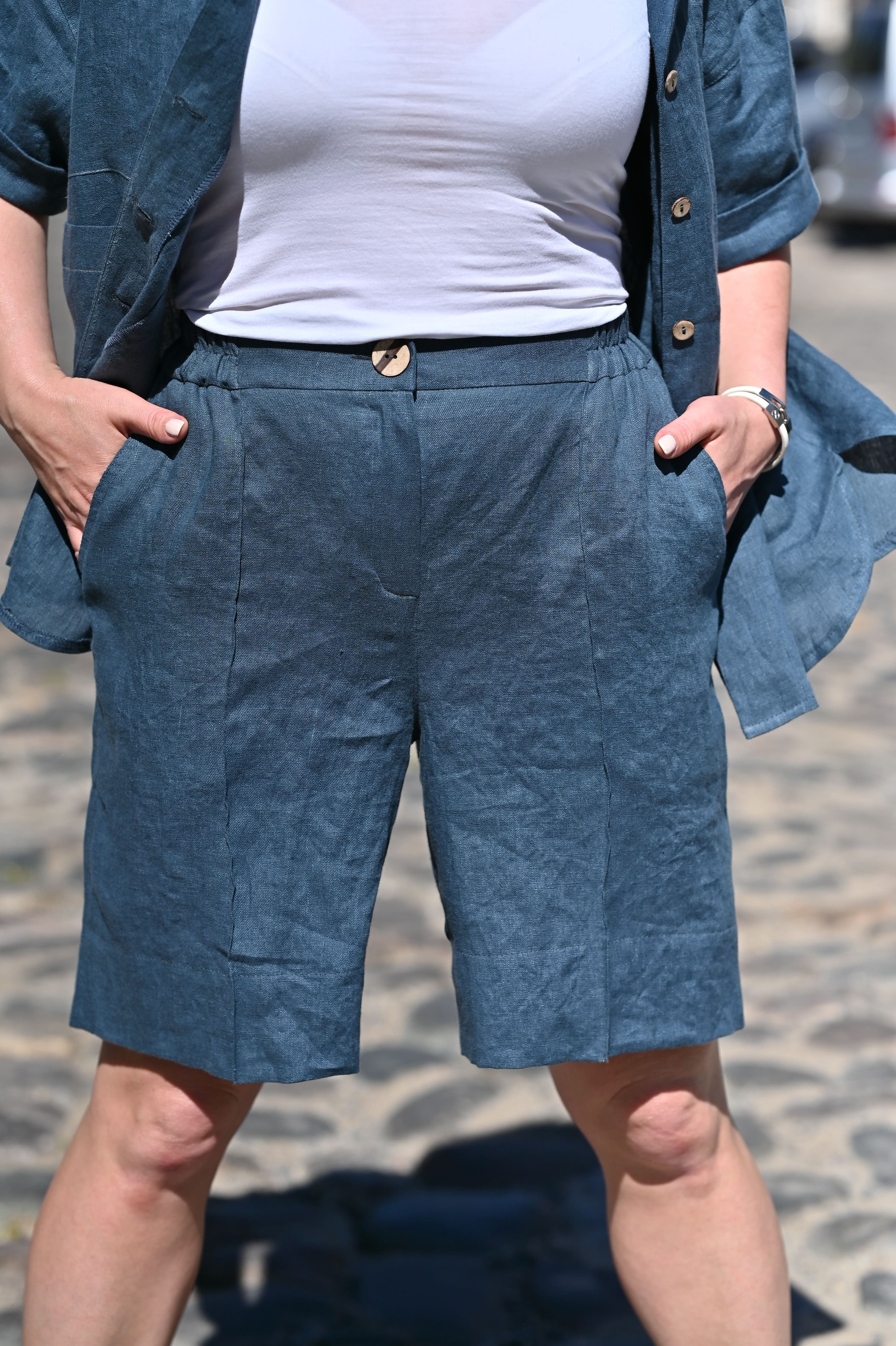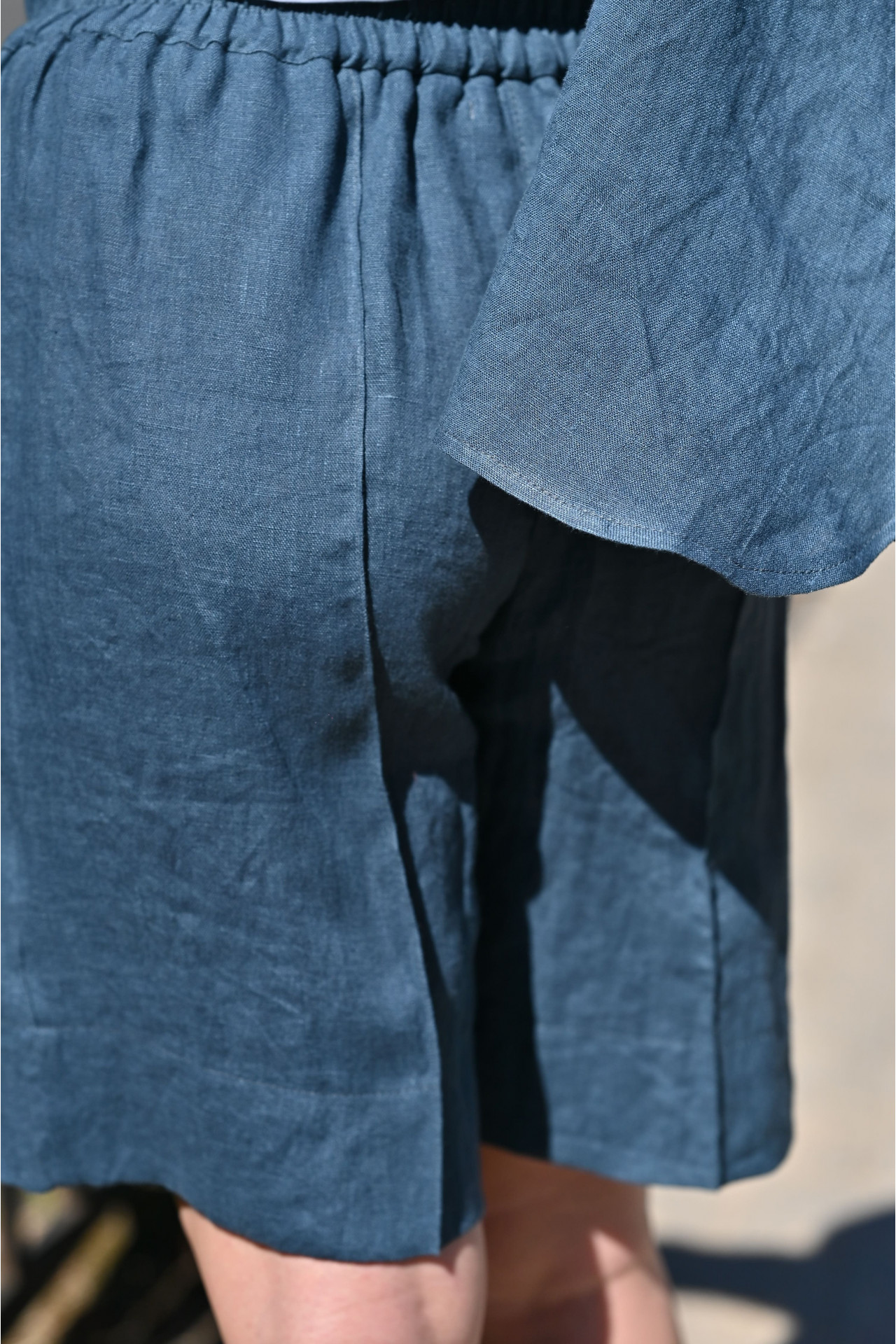 Удлиненные льняные шорты женские свободного силуэта. Закрывают верхнюю часть ноги. Имеют 2 боковых кармана, пояс на резинке. Посадка по линии талии средняя. Изделие выполнено из натурального льна с применением «варки» ткани.