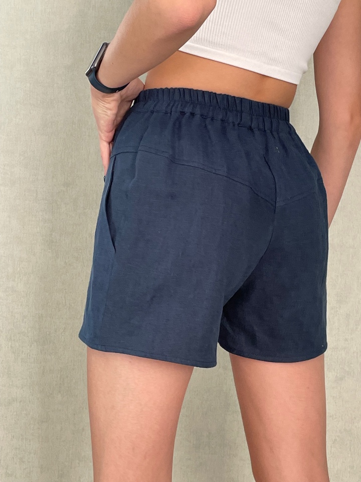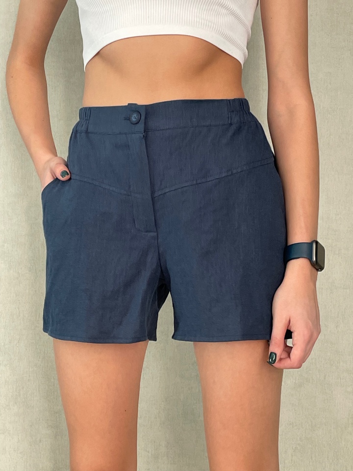 Шорты имеют 2 боковых кармана. В качестве отделки используется х/б лента. В пояс брюк вставлена широкая резинка, что позволяет изделию плотно сидеть на фигуре.