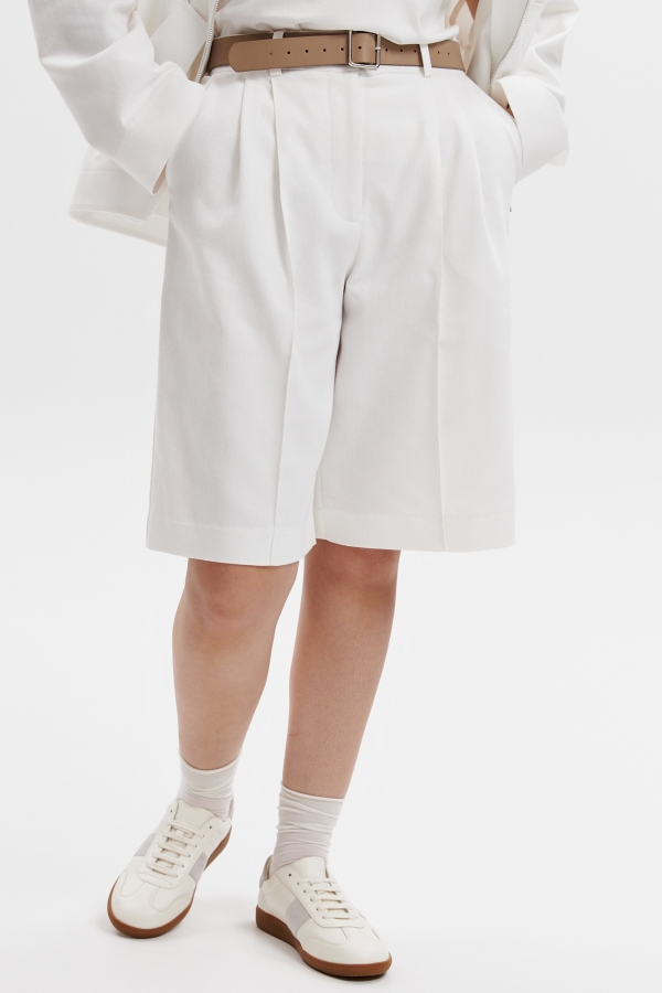 Шорты-бермуды с защипами и стрелкой, с карманами и поясом на резинке.