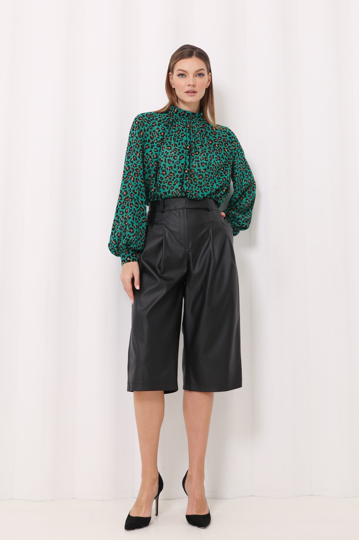 Прямые шорты удлинённого, брючного кроя. Притачной пояс со шлёвками. Защипы по переду и резинка на талии сзади. Застёжка на молнию и брючный крючок. Карманы в боковых швах.