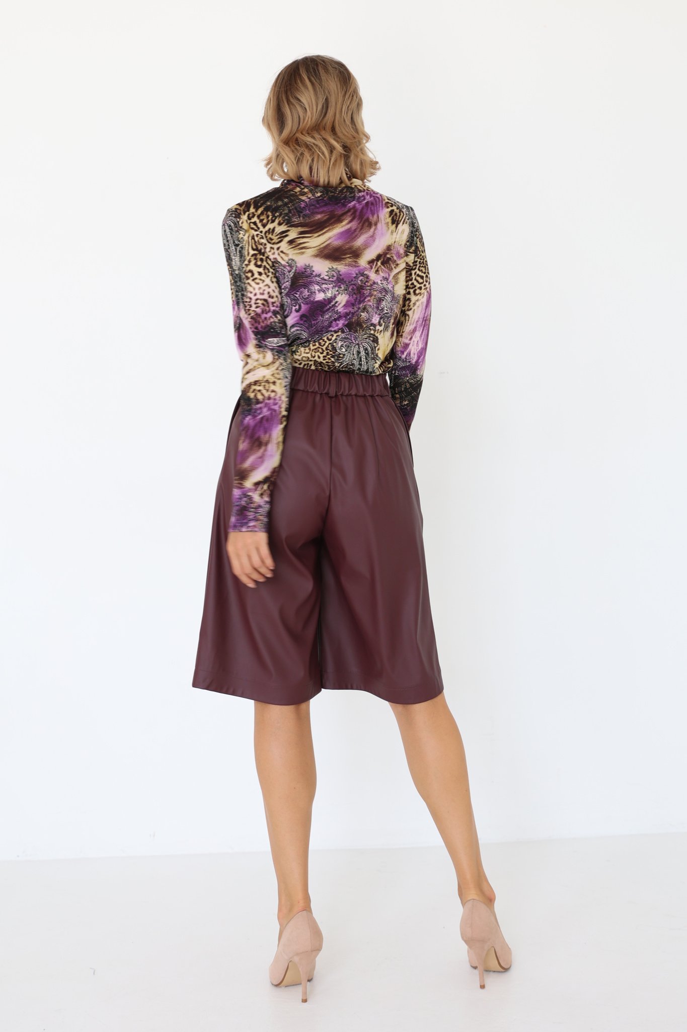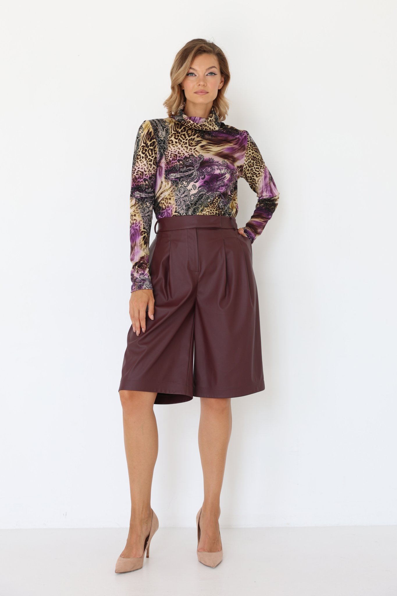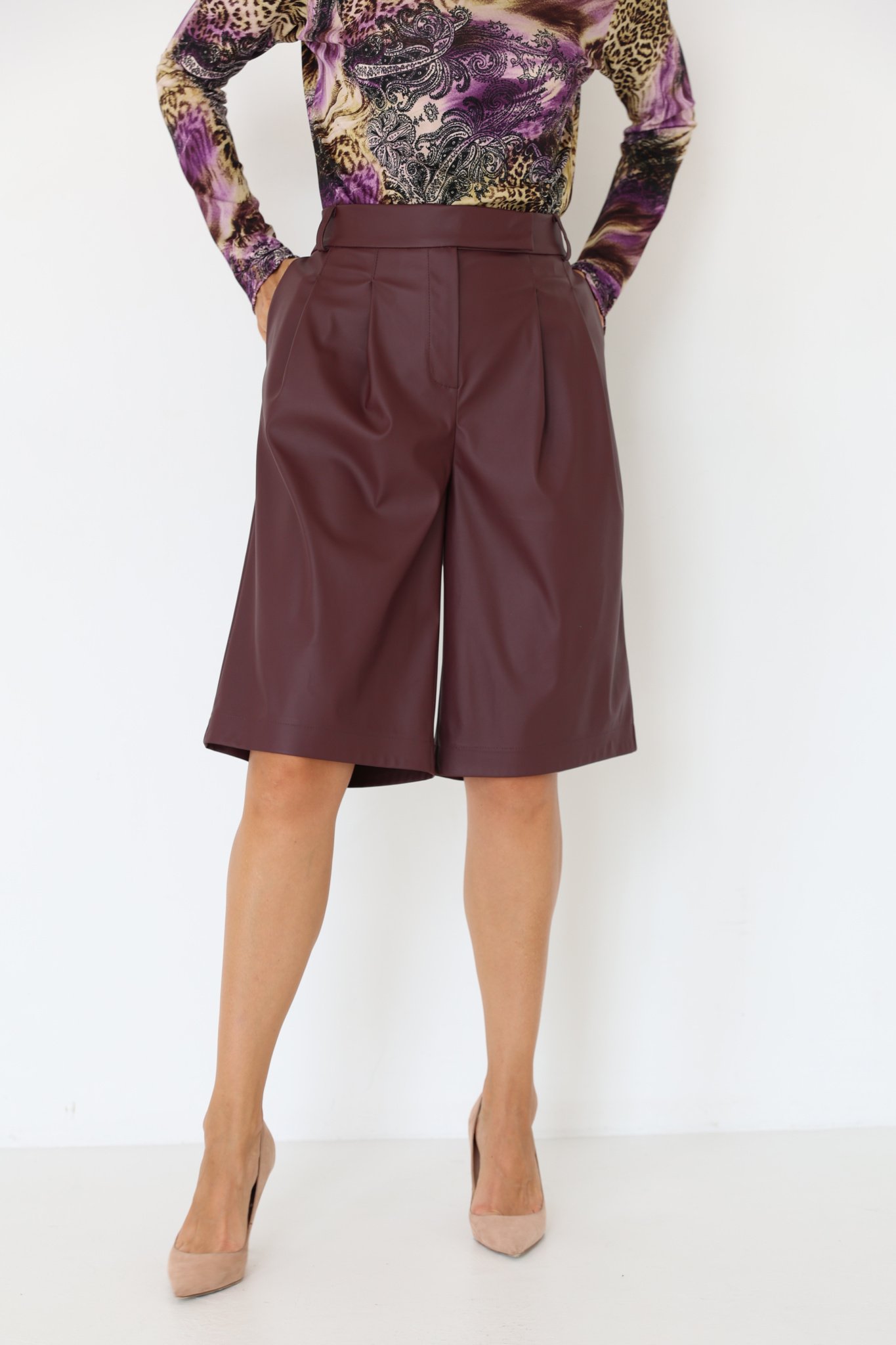 Шорты из искусственной кожи с притачным поясом и резинкой со стороны спинки. Боковые карманы в швах, застежка на молнию и крючок, шлевки на поясе.