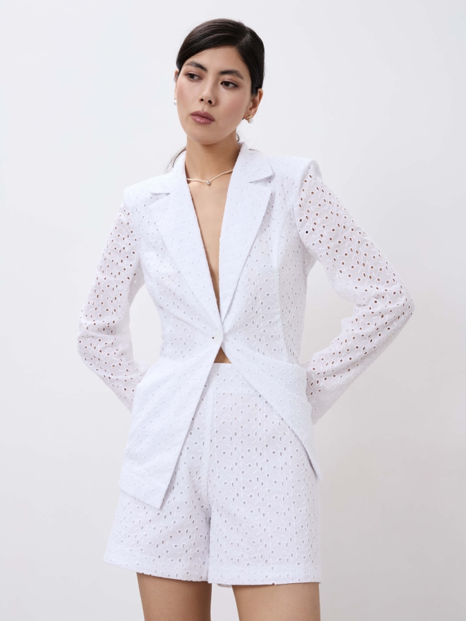 Лаконичные шорты из хлопкового шитья на подкладке из батиста. Модель прилегающая на обтачке, застежка на потайную молнию в боковом шве.