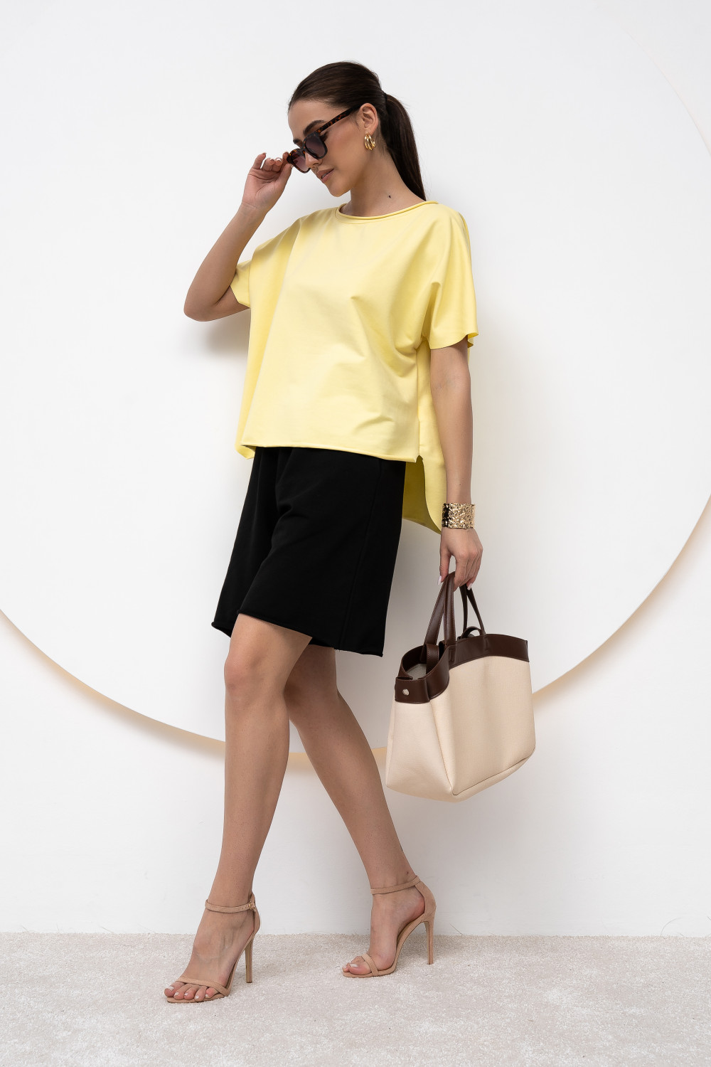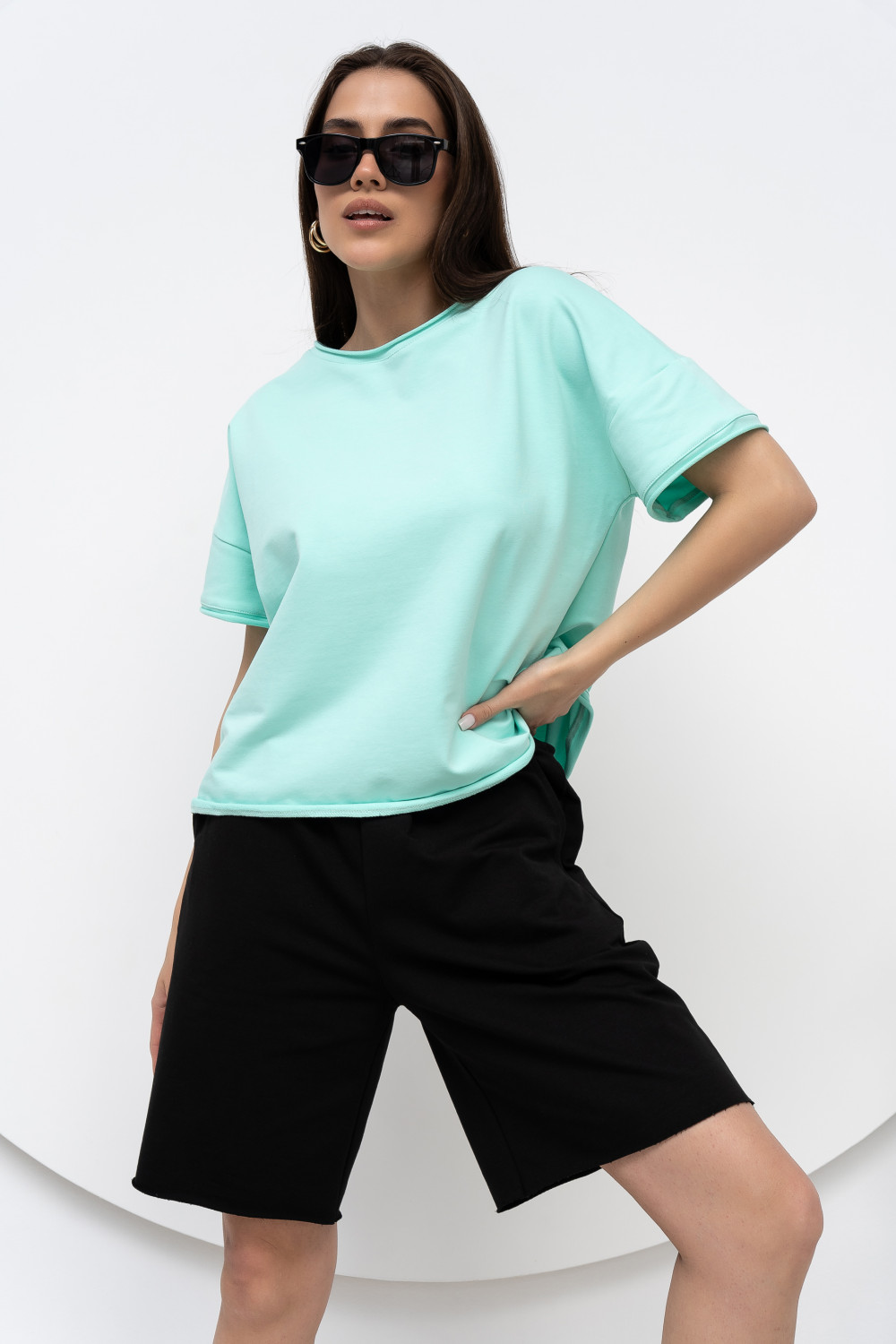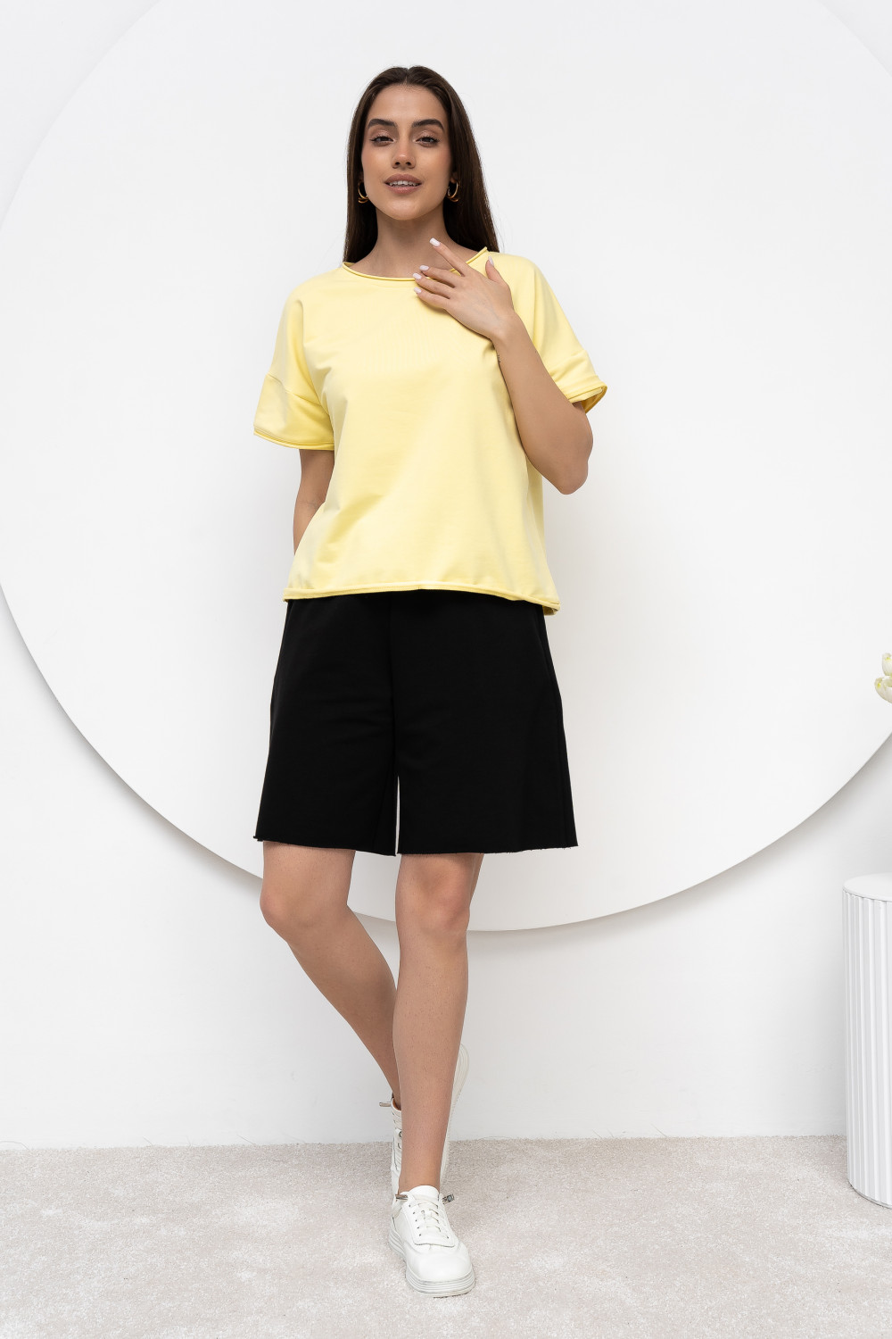 Шорты длиной чуть выше колена выполнены из хлопкового футера с высокой посадкой и карманами в боковых швах. Отстрочка по центру на передней половинке шорт придают особый шик. Выглядит это очень эффектно и стильно. Модель универсальна и сочетается, как с толстовками, свитшотами, так и с футболками.