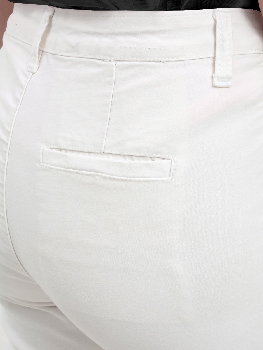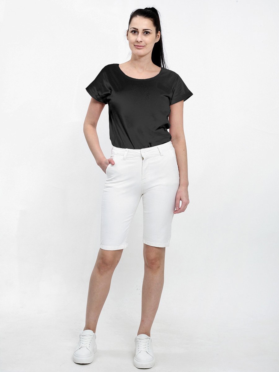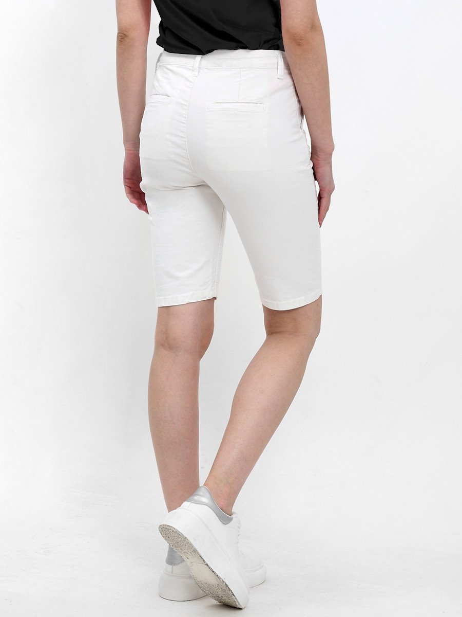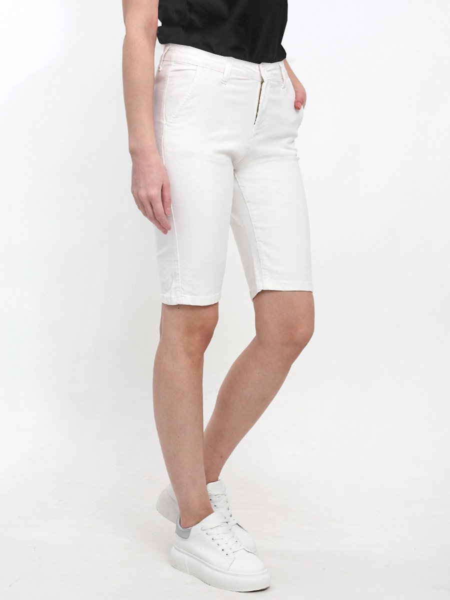 Женские классические шорты Chinos. Посадка Regular fit (полуоблегающие по бедру), заужены к низу. Высокая талия. Застежка на молнии. Сзади прорезные карманы "в листочку". Выполнены из отбеленной  эластичной мягкой ткани gabardine stretch. Изделие постирано в готовом виде после пошива. Параметры указаны для размера 28. Длина внутреннего шва для всех размеров  - 28,0 см.