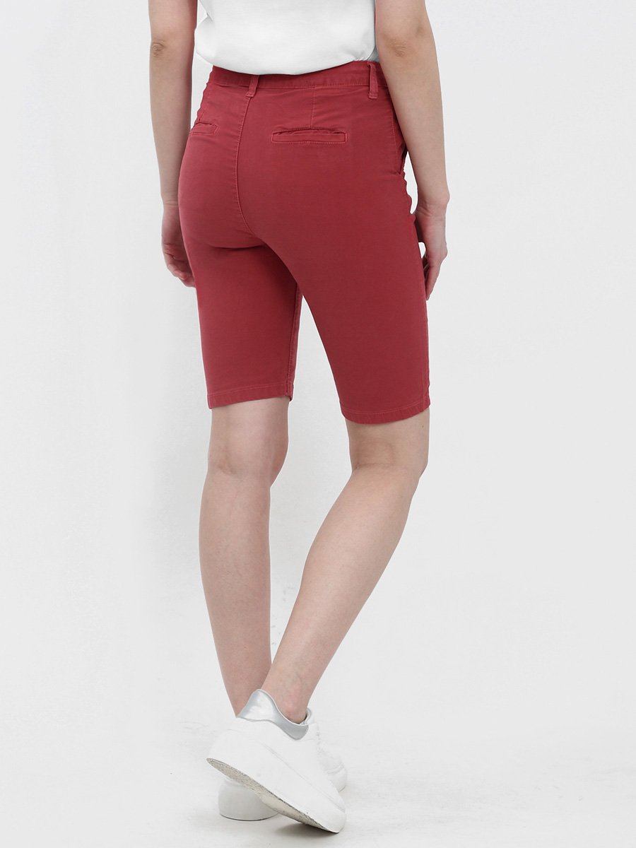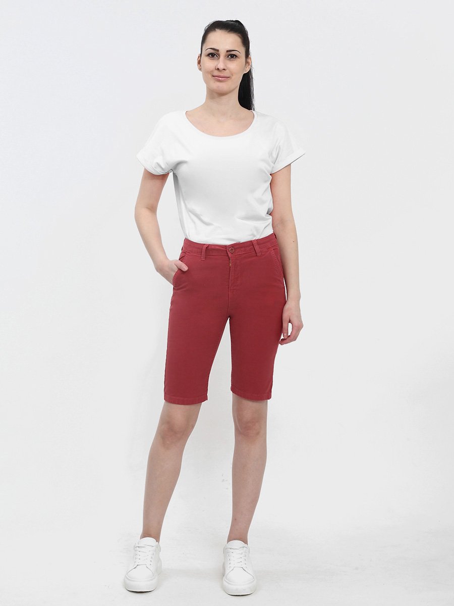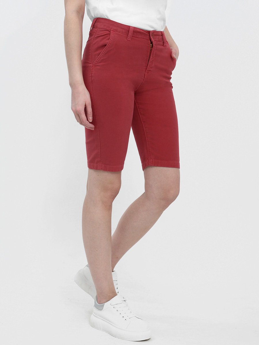 Женские классические шорты Chinos. Посадка Regular fit (полуоблегающие по бедру), заужены к низу. Высокая талия. Застежка на молнии. Сзади прорезные карманы "в листочку". Выполнены из отбеленной  эластичной мягкой ткани gabardine stretch. Изделие постирано в готовом виде после пошива. Параметры указаны для размера 28. Длина внутреннего шва для всех размеров  - 28,0 см.