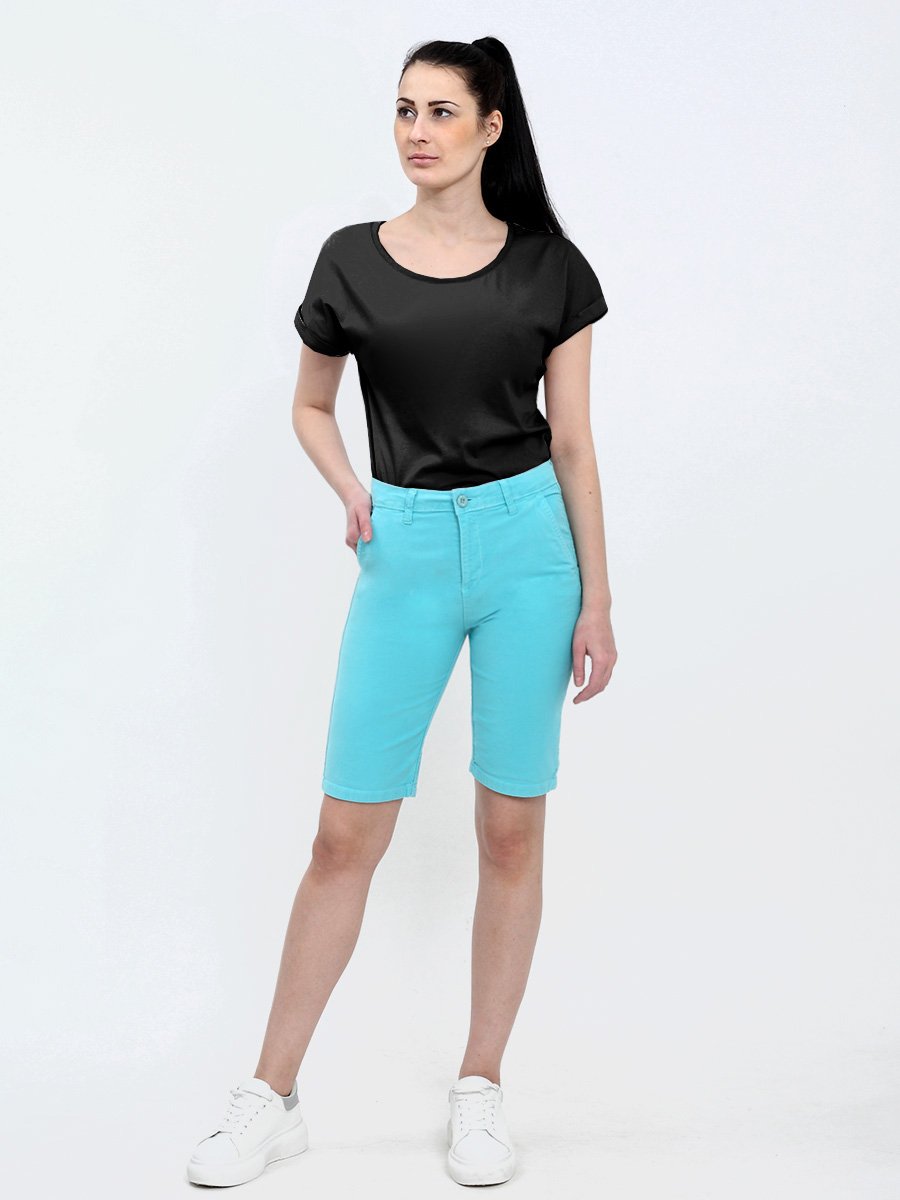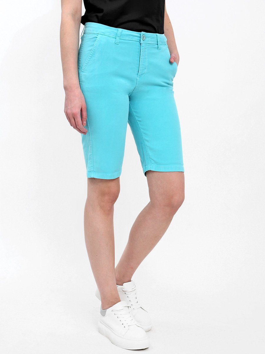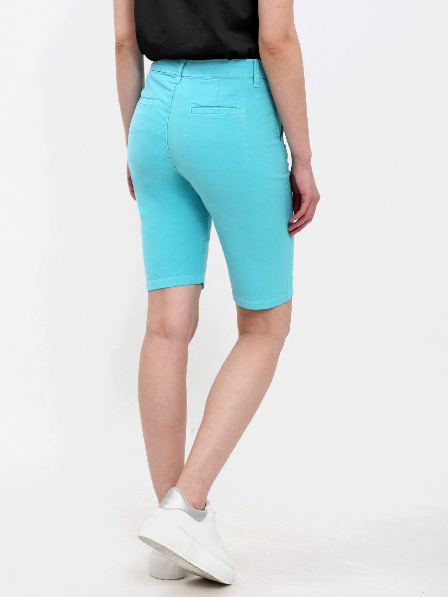 Женские классические шорты Chinos. Посадка Regular fit (полуоблегающие по бедру), заужены к низу. Высокая талия. Застежка на молнии. Сзади прорезные карманы "в листочку". Выполнены из отбеленной  эластичной мягкой ткани gabardine stretch. Изделие постирано в готовом виде после пошива. Параметры указаны для размера 28. Длина внутреннего шва для всех размеров  - 28,0 см.