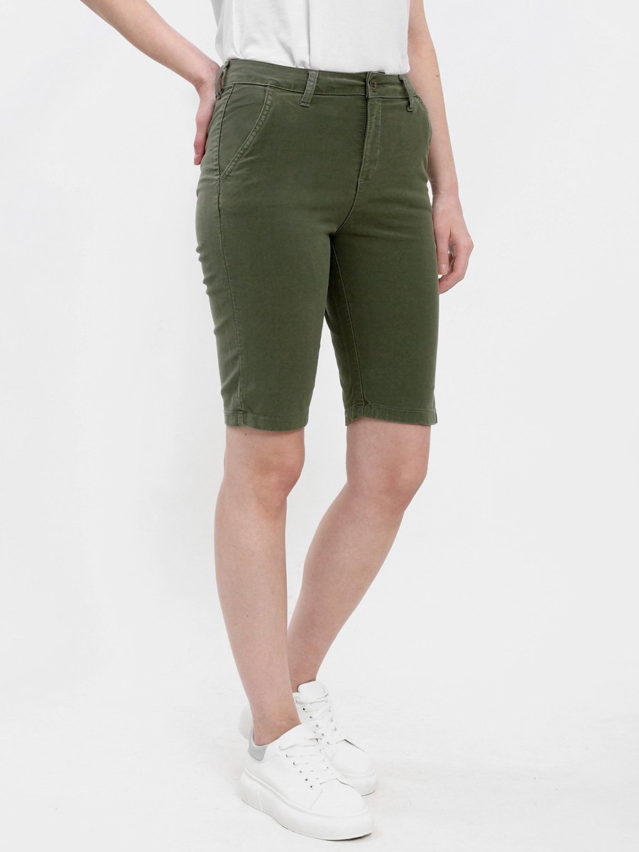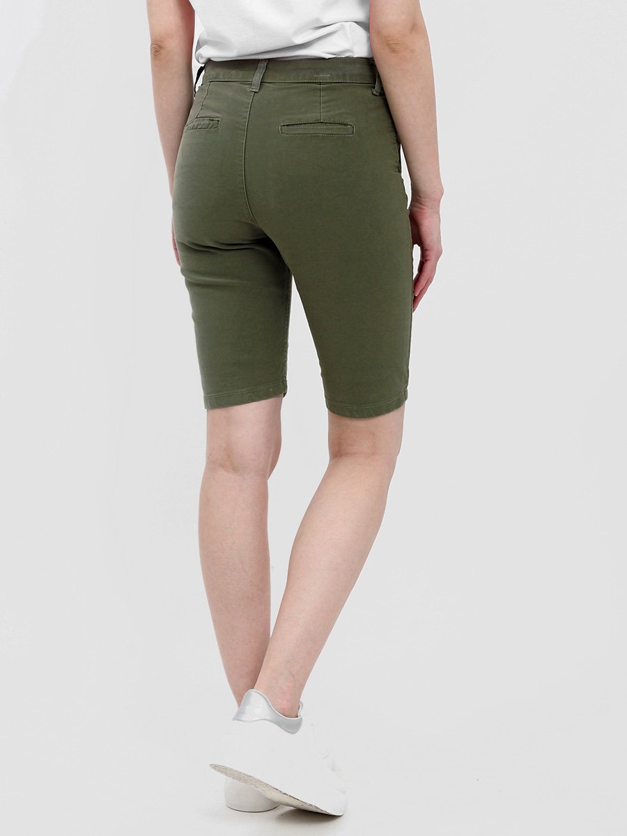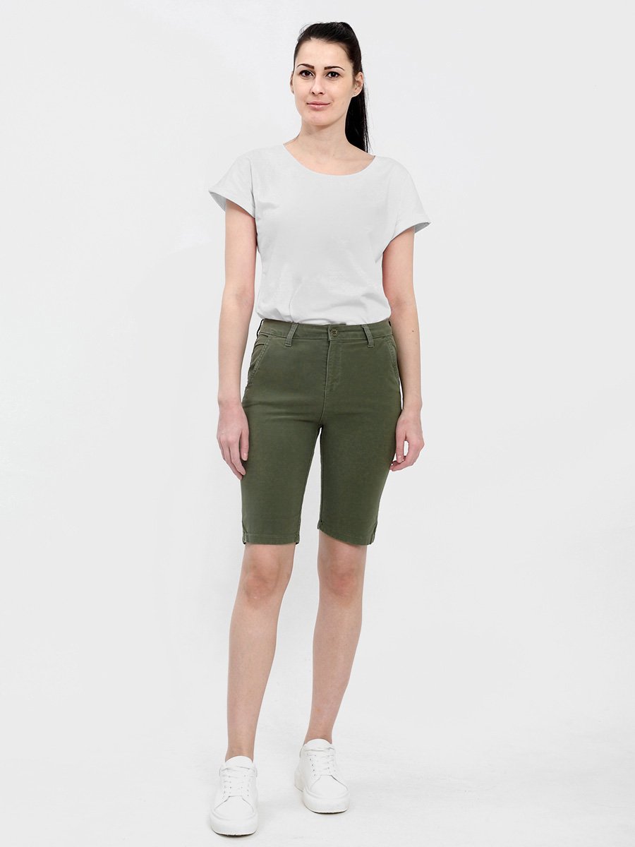 Женские классические шорты Chinos. Посадка Regular fit (полуоблегающие по бедру), заужены к низу. Высокая талия. Застежка на молнии. Сзади прорезные карманы "в листочку". Выполнены из отбеленной  эластичной мягкой ткани gabardine stretch. Изделие постирано в готовом виде после пошива. Параметры указаны для размера 28. Длина внутреннего шва для всех размеров  - 28,0 см.