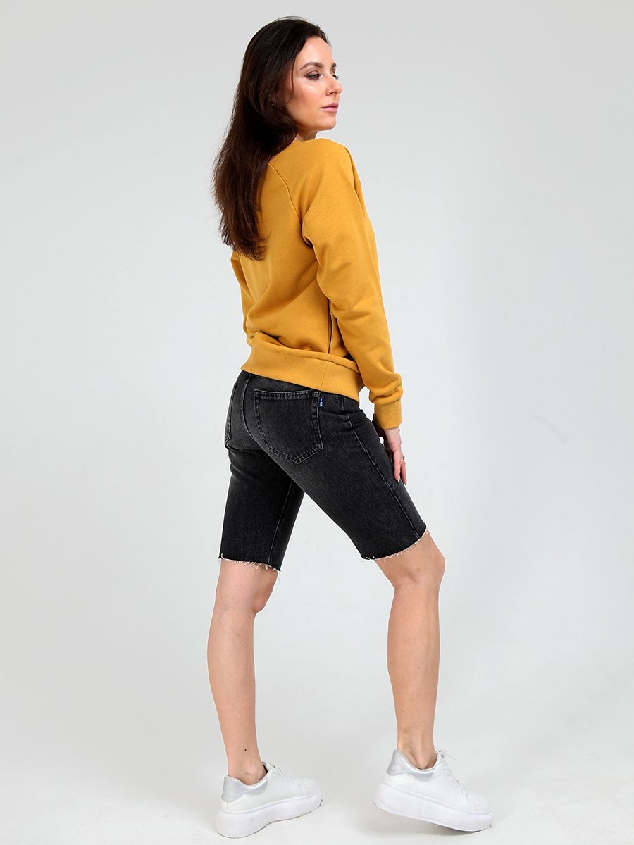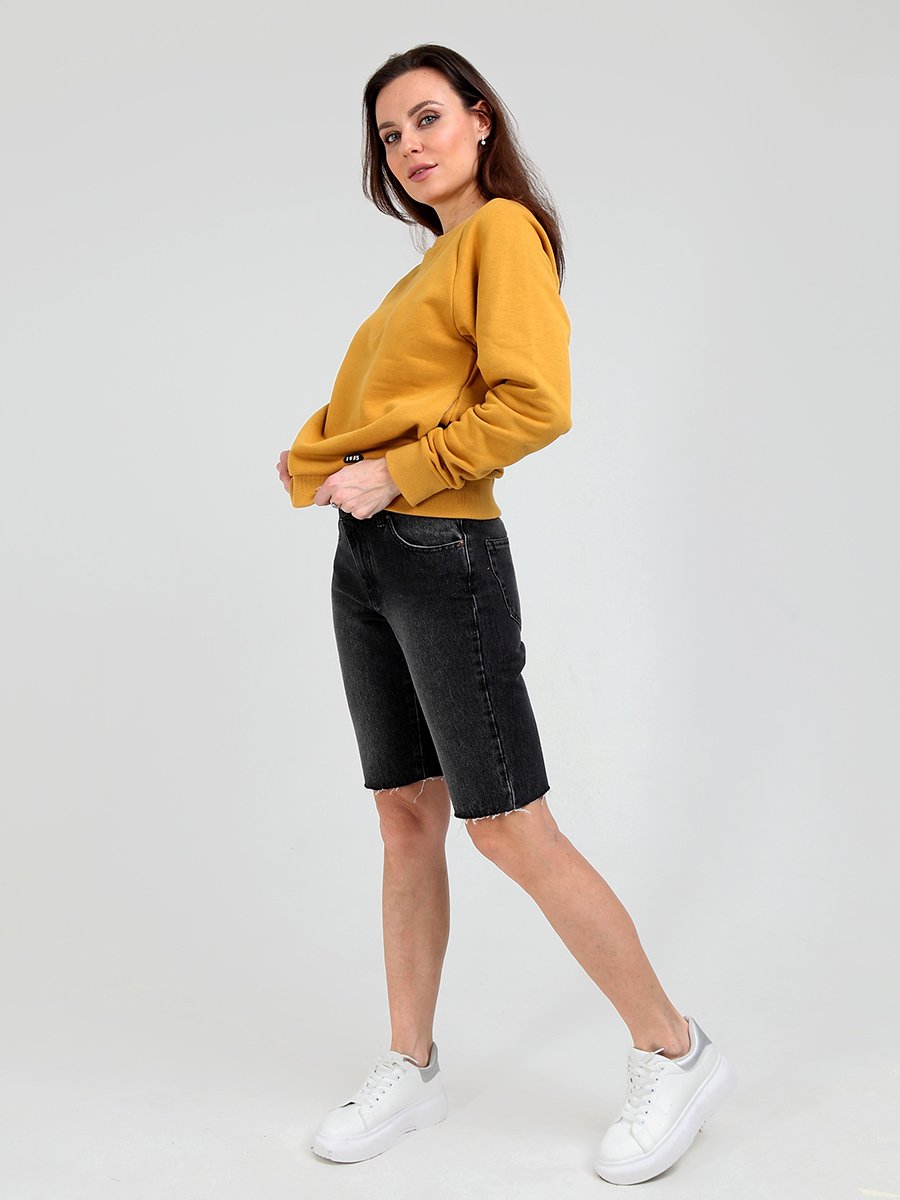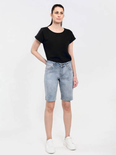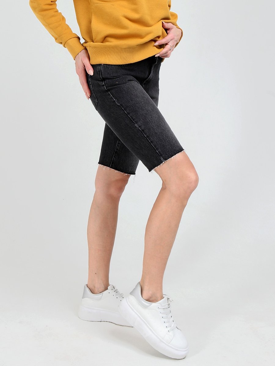 Женские удлиненные шорты с пятью карманами. Посадка Comfort fit (свободные по бедру), зауженные к низу,  высокая талия спереди и сзади. Застежка на молнии. Выполнены из слабоэластичной ткани  Black denim (лицевая сторона ткани черная, изнаночная сторона- белая) с потертостями спереди и сзади. Параметры указаны для размера 28.