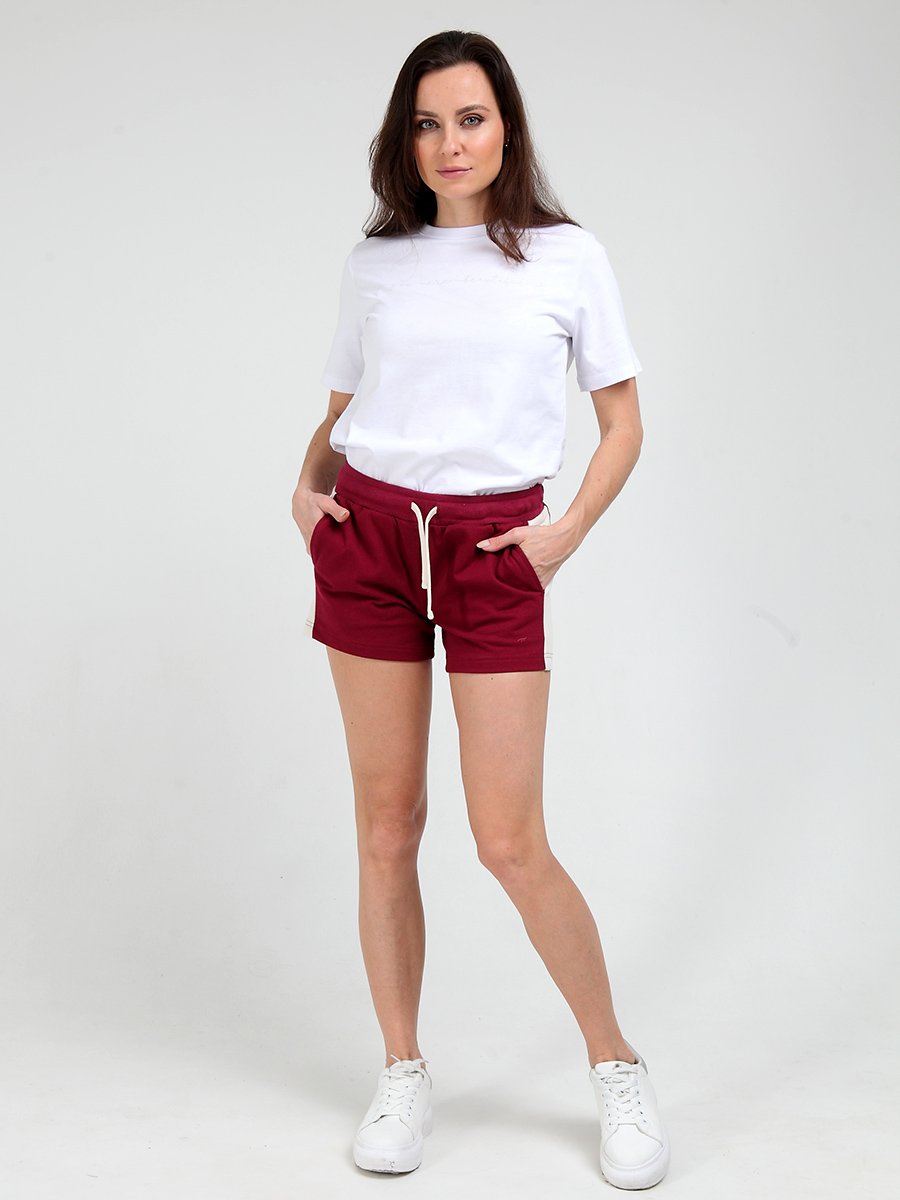 Женские трикотажные шорты, выполнены из хлопкового полотна с добавлением полиэстра. Приятны при контакте с кожей, не сковывают движения. С боков оформлены лампасами контрастного цвета. В боковых швах карманы. В поясе шорты собираются широкой резинкой. Дополнительно в поясе имеется шнур.