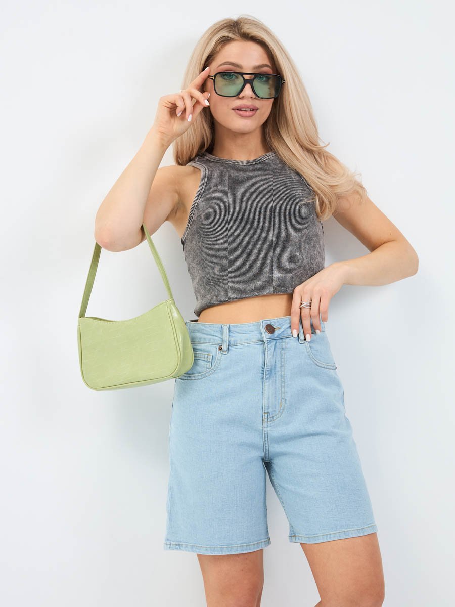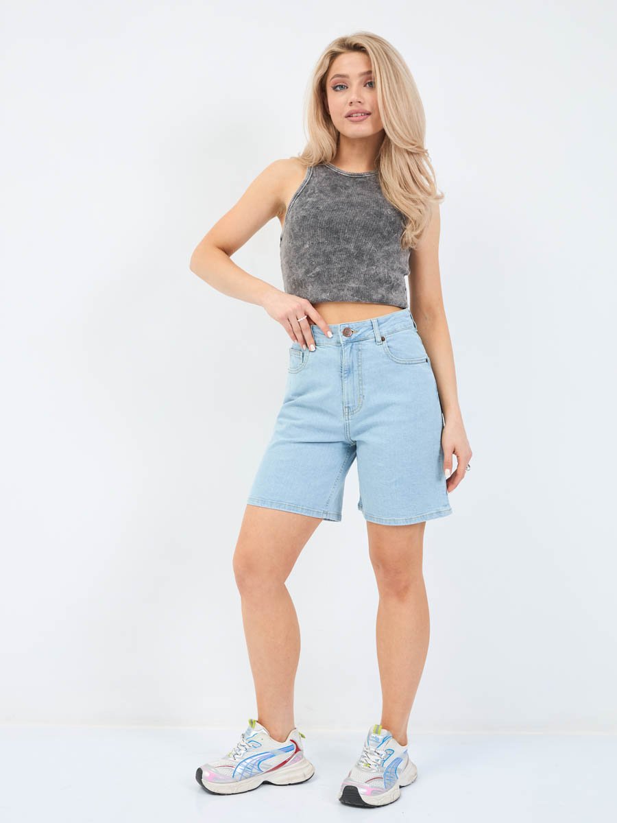 Женские шорты с пятью карманами. Посадка Comfort fit (свободные по бедру), высокая талия спереди и сзади. Застежка на молнии. Выполнены из слабоэластичной ткани denim comfort stretch. Классическая светлая стирка "stone wash"с  отбеливанием.