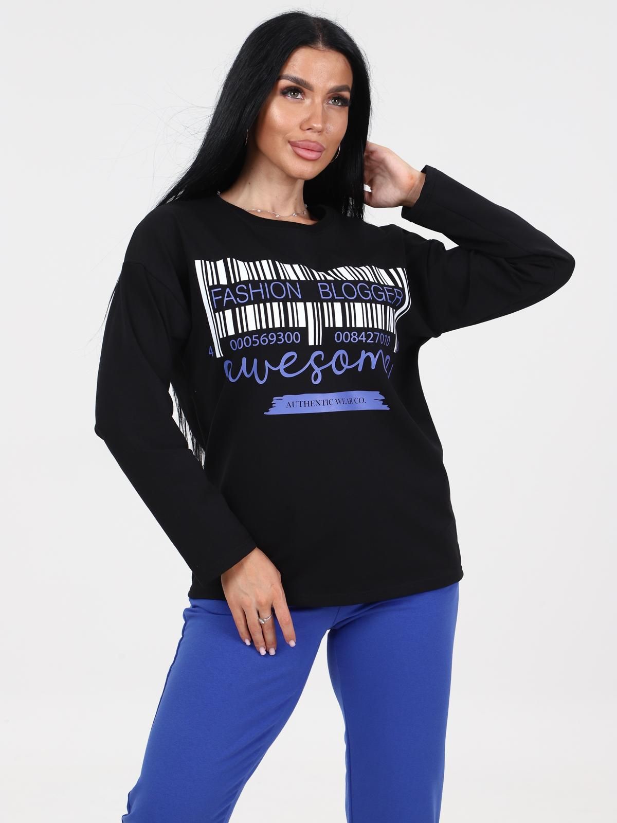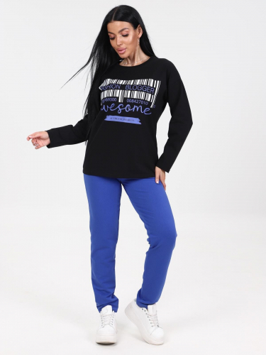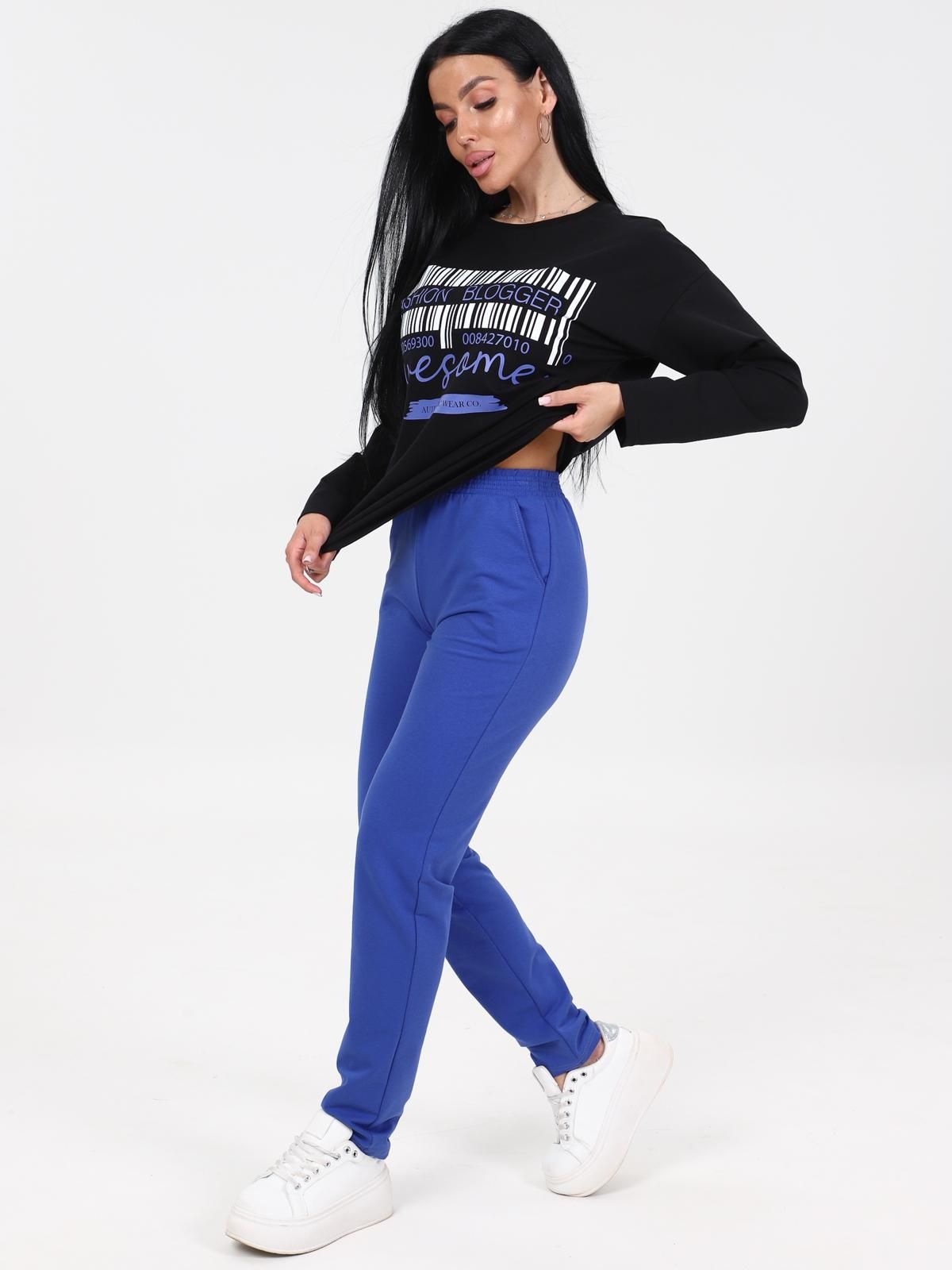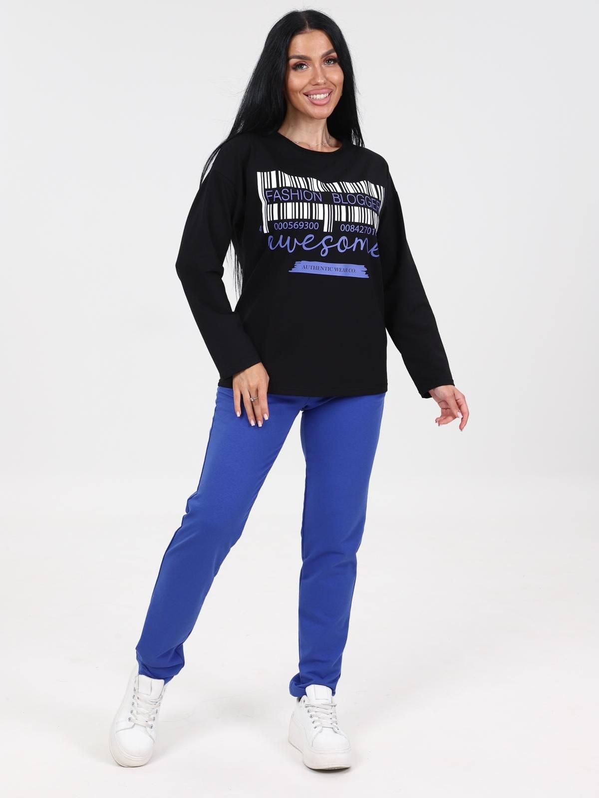 Женский костюм состоит из свитшота и брюк. Брюки длинные с карманами в боковых швах, на притачном простроченном поясе. Свитшот прямого силуэта со спущенной линией плеча. Рукав длинный. Круглый вырез горловины обработан планкой из эластичной ткани.