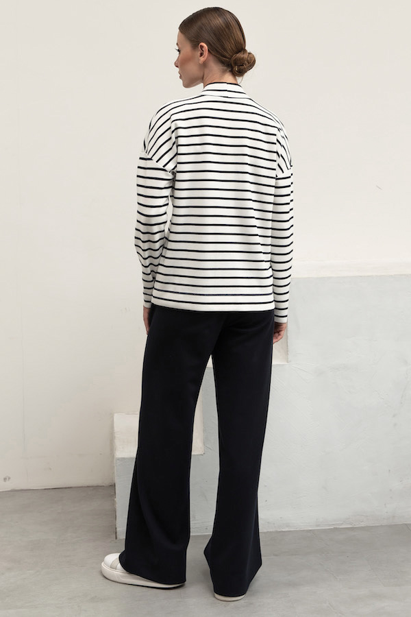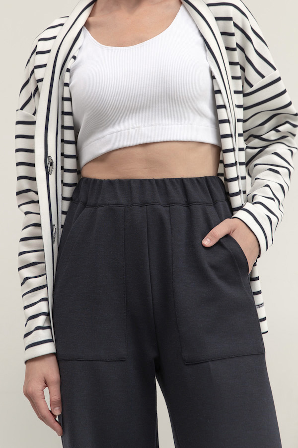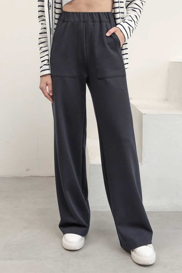 Брюки прямого силуэта из эластичного полотна. Пояс притачной с эластичной резиной. На передней части брюк выполнены накладные карманы.