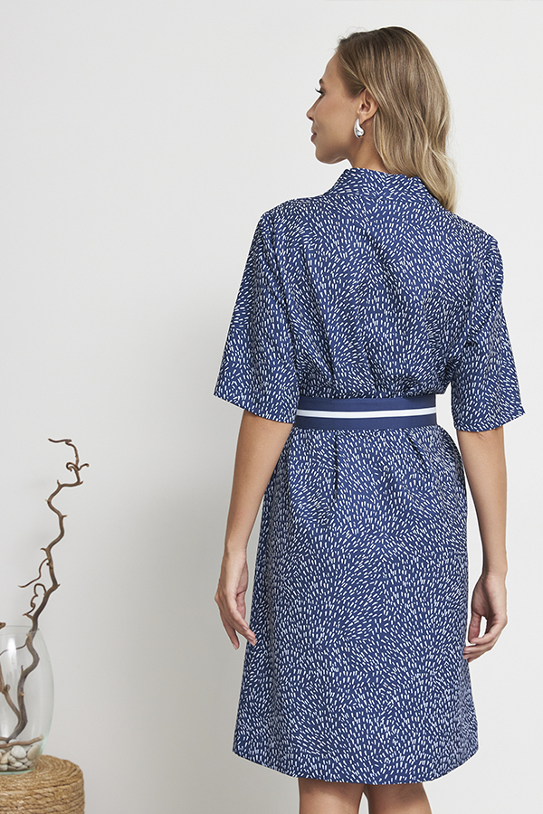 Платье свободного силуэта из плательной ткани. По центру передней части изделия выполнен шов. Цельнокроеная стойка, переходящая в V-образный вырез горловины, визуально делает фигуру стройнее. Втачной короткий рукав.