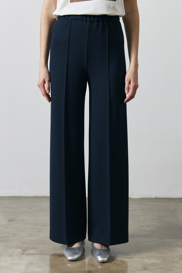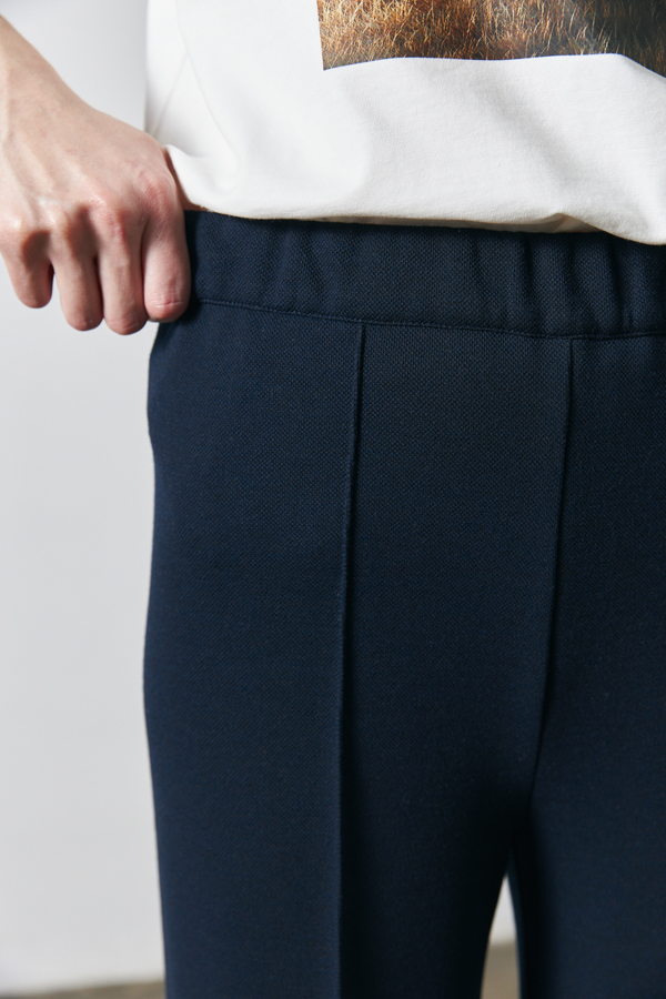 Брюки прямого силуэта из эластичного полотна. Пояс притачной с эластичной резиной. На передней части брюк застрочены стрелки.
