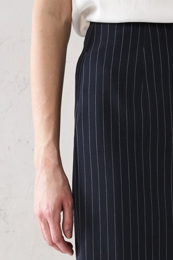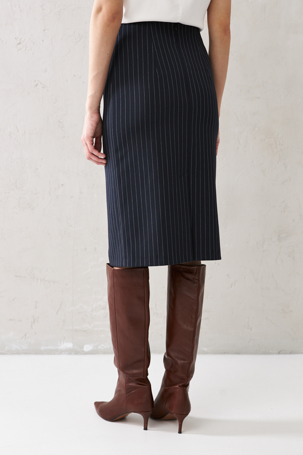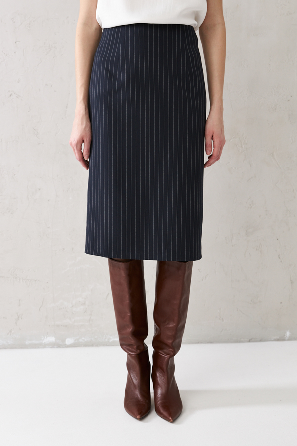 Юбка прилегающего силуэта из костюмной ткани. Сзади по среднему шву застёжка-молния, снизу шлица с разрезом. Изделие без пояса, верхний срез обработан обтачкой. На передней и задней половине юбки выполнены талиевые вытачки. Юбка на притачной подкладке.