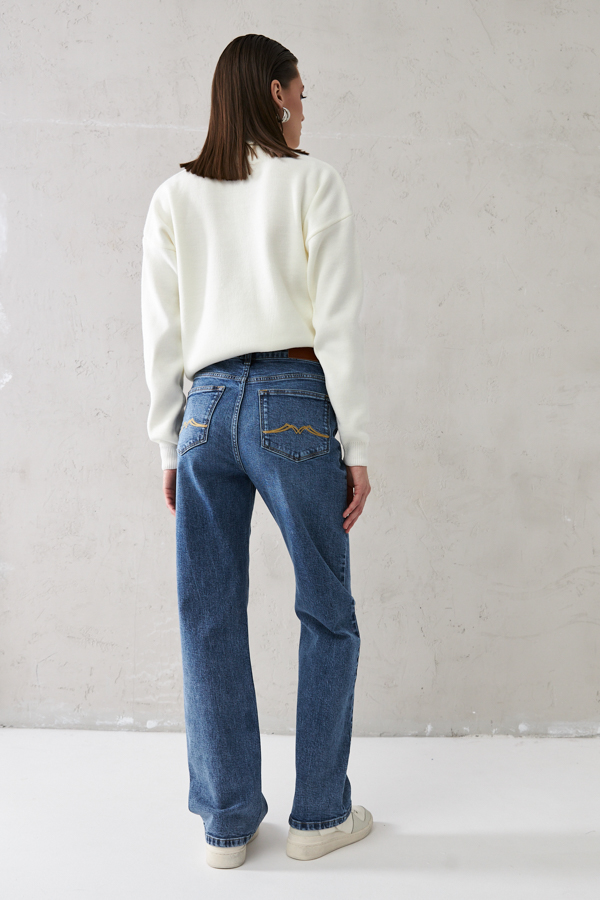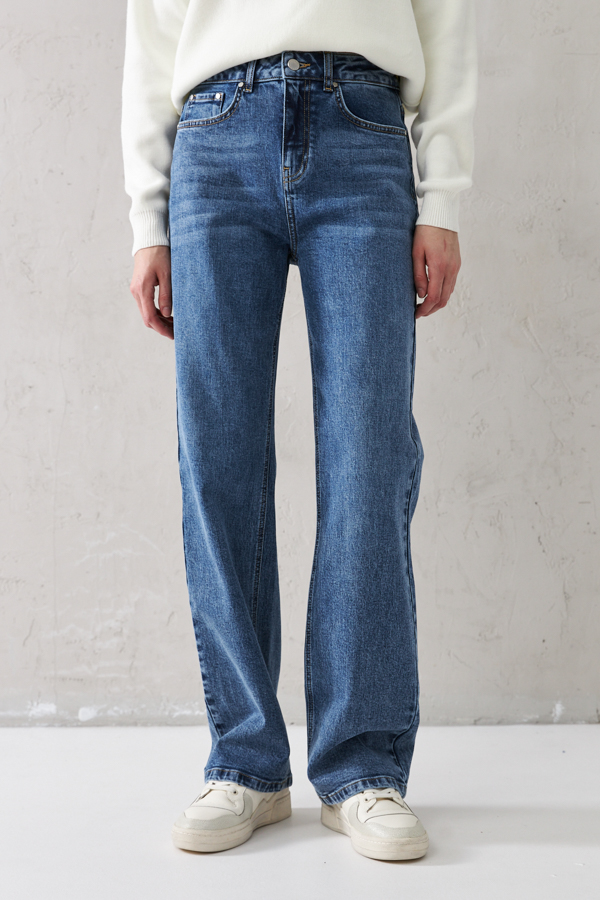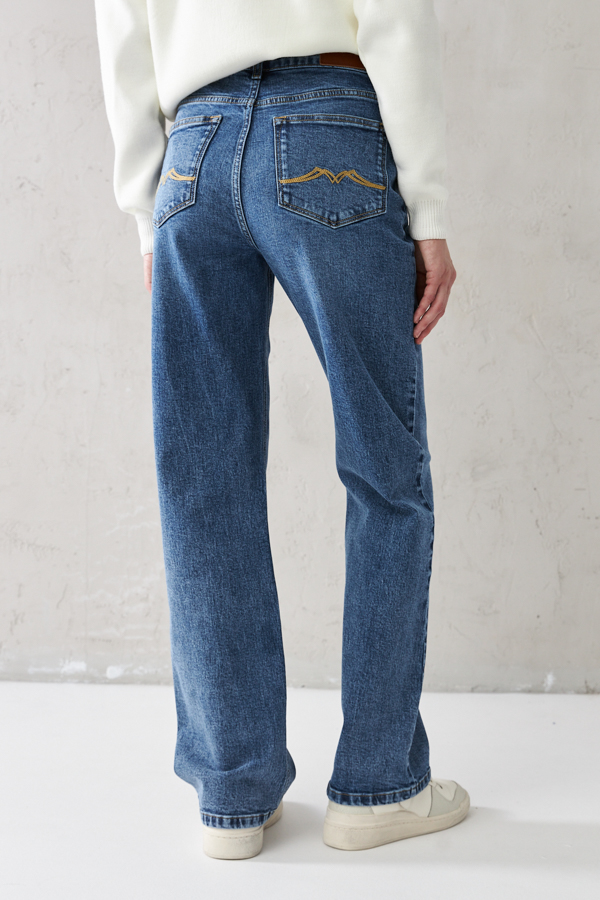 Брюки из эластичного денима выполнены по классической джинсовой технологии (варка с эффектом легкого выбеливания). Прямой классический крой. На задней части брюк выполнены накладные карманы, на передней - карманы с подкройным бочком. Притачной пояс со шлёвками. Застёжка на молнию-гульфик и пуговицу.