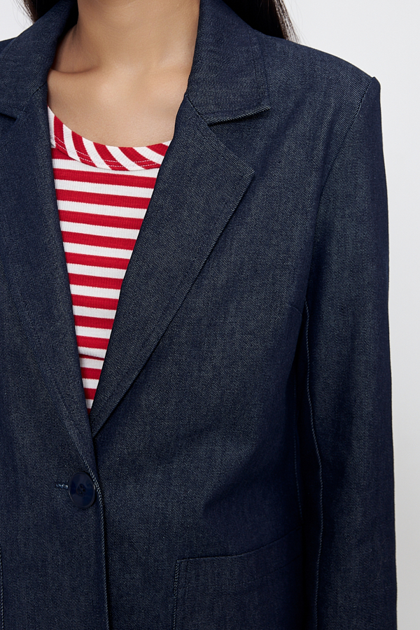 Жакет прямого силуэта с английским воротником из хлопковой ткани. На передней части жакета застежка на пуговицу и накладные карманы. Втачной длинный рукав. Изделие имеет четкую линию плеча благодаря плечевым накладкам.