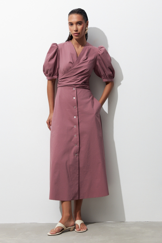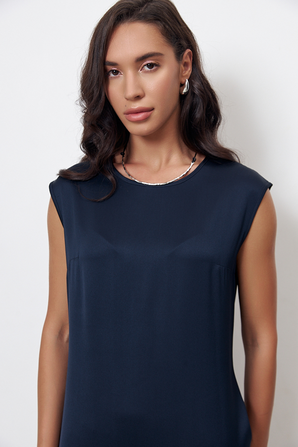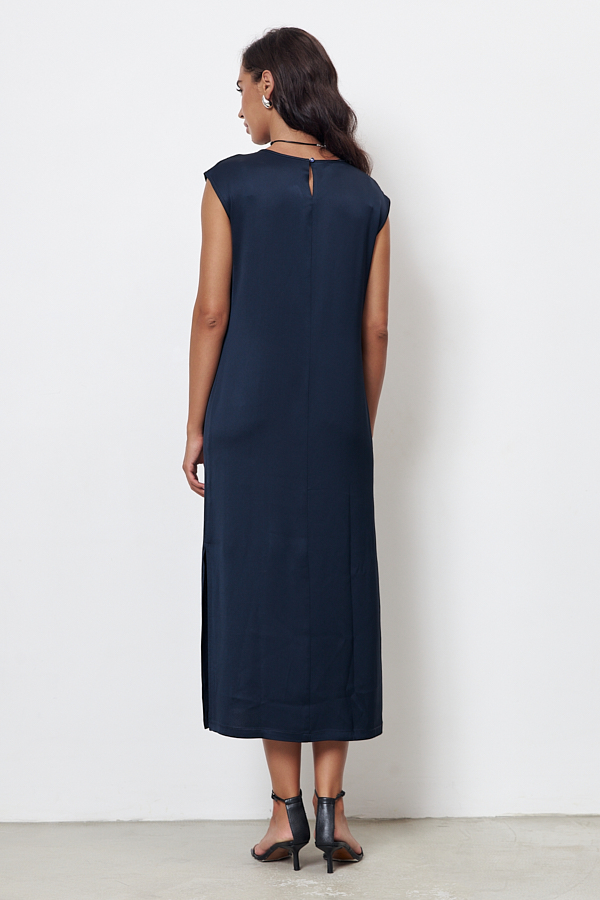 Платье из вискозной ткани с сатиновым блеском. Полуприлегающий силуэт, с разрезом в боковом шве. По среднему шву спинки застёжка на петлю-пуговицу. Круглый вырез горловины и линия проймы окантованы косыми бейками из основной ткани.