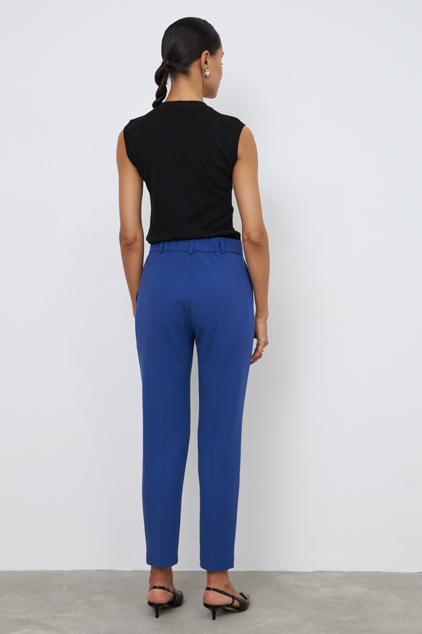 Брюки прямого силуэта, зауженные книзу из костюмной ткани. Застёжка на молнию-гульфик и пуговицу. Карманы с подкройным бочком. Притачной пояс со шлёвками.