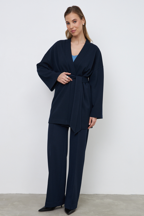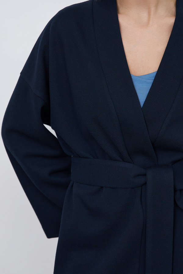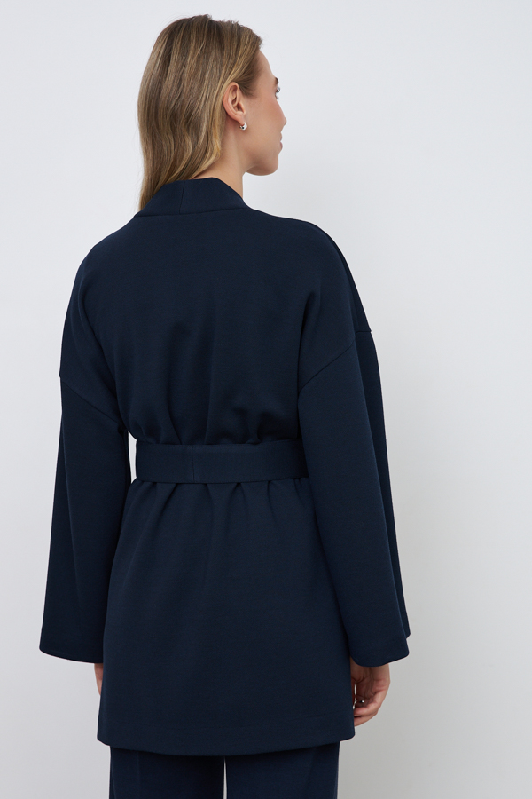 Кардиган из эластичного полотна свободного силуэта с притачной планкой. Втачной широкий рукав в спущенную пройму. В комплекте пояс, позволяющий создавать приталенный силуэт.
