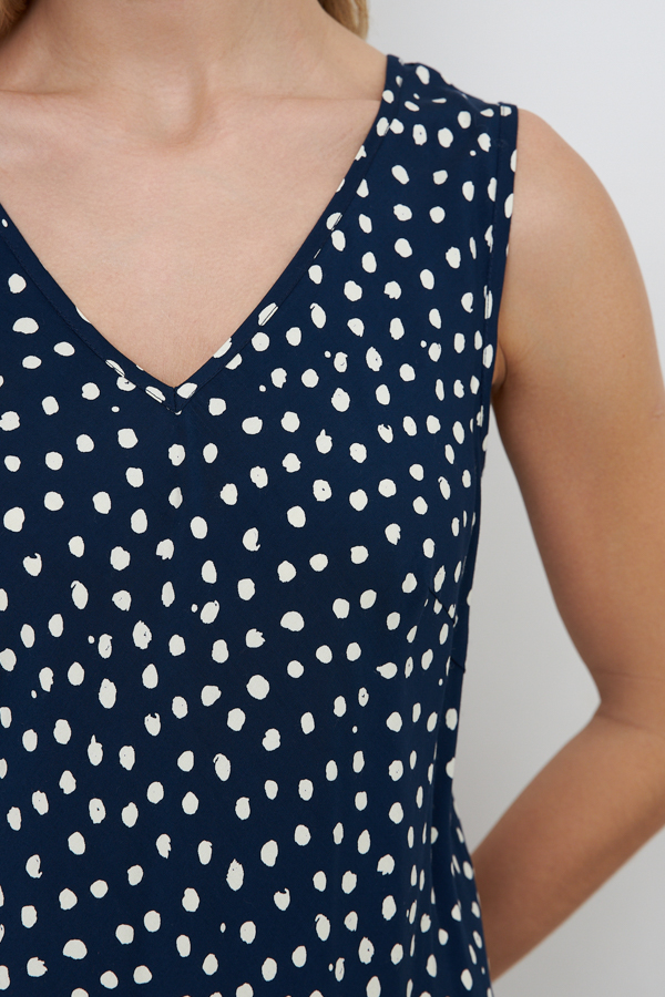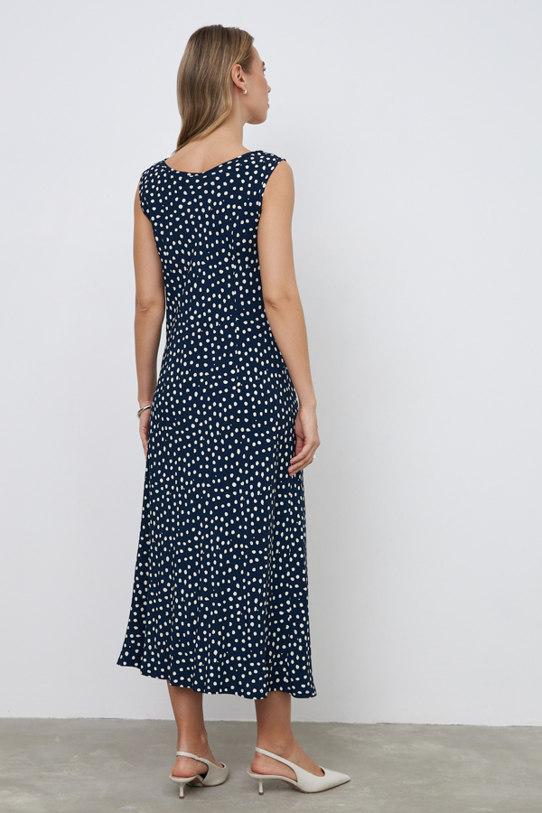 Платье из вискозной ткани полуприлегающего силуэта. Изделие, слегка расширенное книзу. Крой платья по косой. V-образный вырез горловины и линия проймы оформлены косыми бейками.