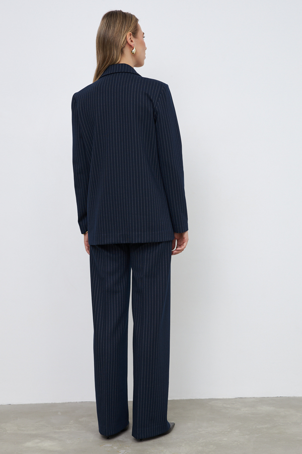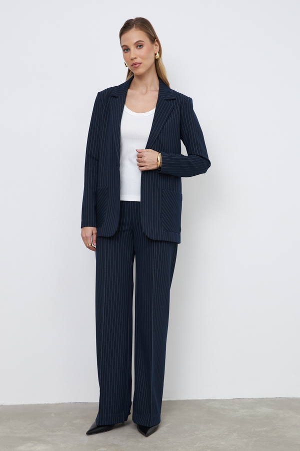 Костюм выполнен из эластичного полотна. Брюки прямого силуэта. На передней части брюк застрочены стрелки. Пояс с эластичной резиной. Жакет прямого силуэта с английским воротником и накладными карманами. На передней части жакета застежка на пуговицу. Втачной длинный рукав. Изделие с плечевыми накладками, которые при желании можно убрать.