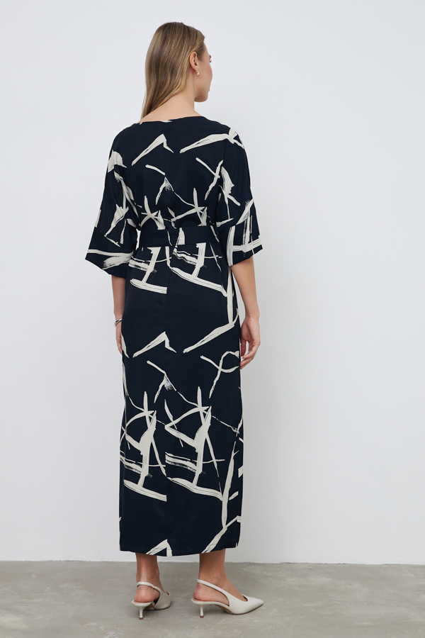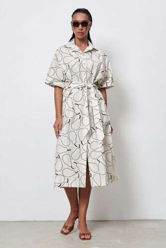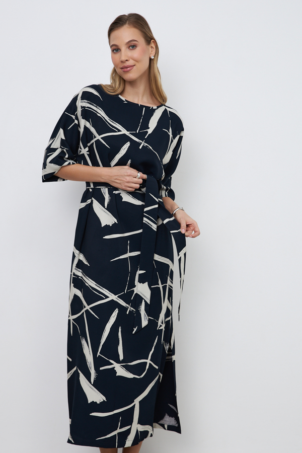 Платье из вискозной ткани. Свободный силуэт, с разрезом в боковом шве. Круглый вырез горловины окантован косой бейкой из основной ткани. Цельнокроеный рукав с притачной манжетой. В комплекте пояс из основной ткани. В таблице размеров представлены параметры человека, а не изделия.