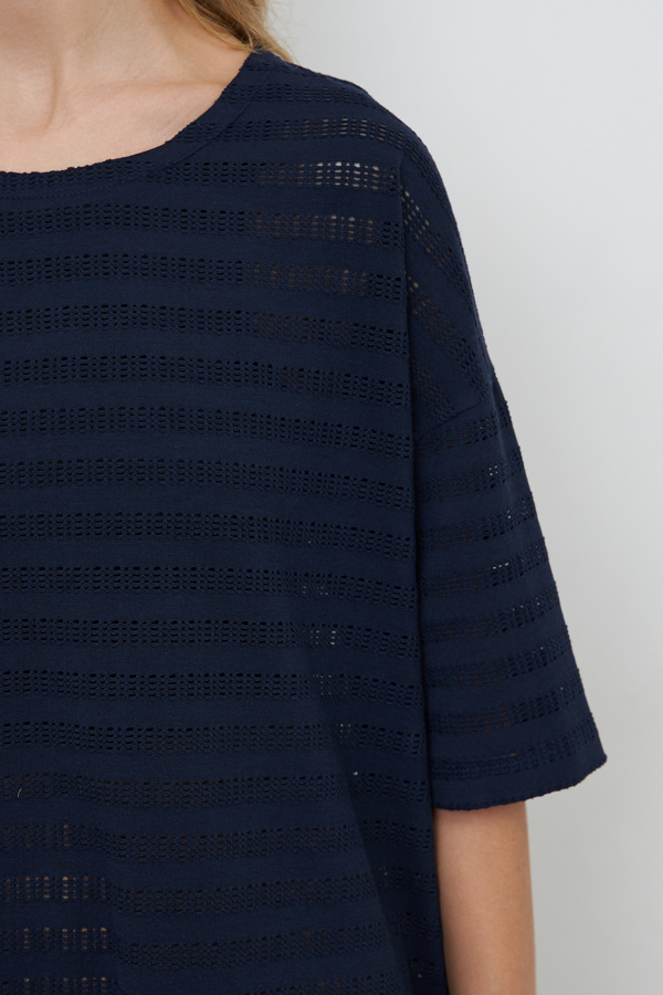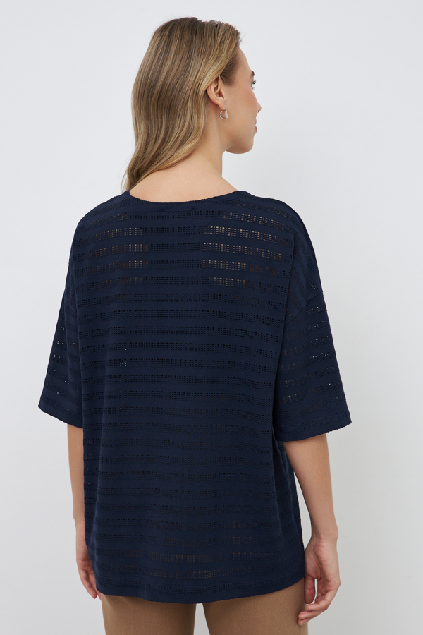Джемпер свободного силуэта со спущенной линией плеча и рукавом до локтя выполнен из эластичного полотна. Круглый вырез горловины. В таблице размеров представлены параметры человека, а не изделия.