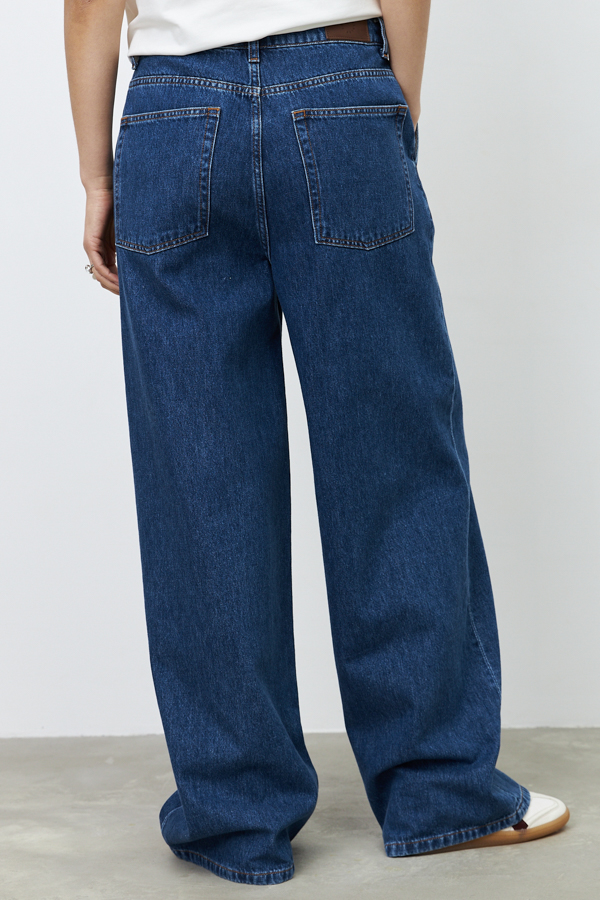 Брюки из денима выполнены по классической джинсовой технологии (варка с эффектом легкого выбеливания). Прямой широкий крой. На задней части брюк выполнены накладные карманы, на передней - карманы с подкройным бочком. Притачной пояс со шлёвками и кулиской. Застёжка на молнию-гульфик и пуговицу.