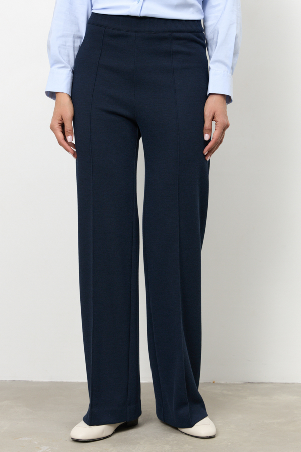 Брюки прямого силуэта из эластичного полотна. Пояс с эластичной резиной. На передней части брюк застрочены стрелки.