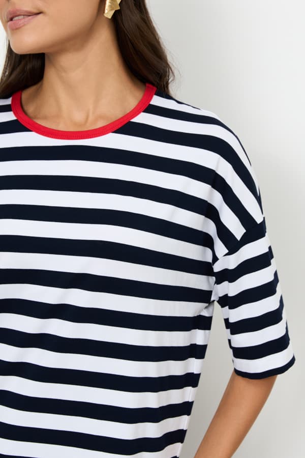 Джемпер из эластичного полотна. Свободный силуэт со спущенной линией плеча и коротким рукавом. Вырез горловины окантован эластичной бейкой. В таблице размеров представлены параметры человека, а не изделия.