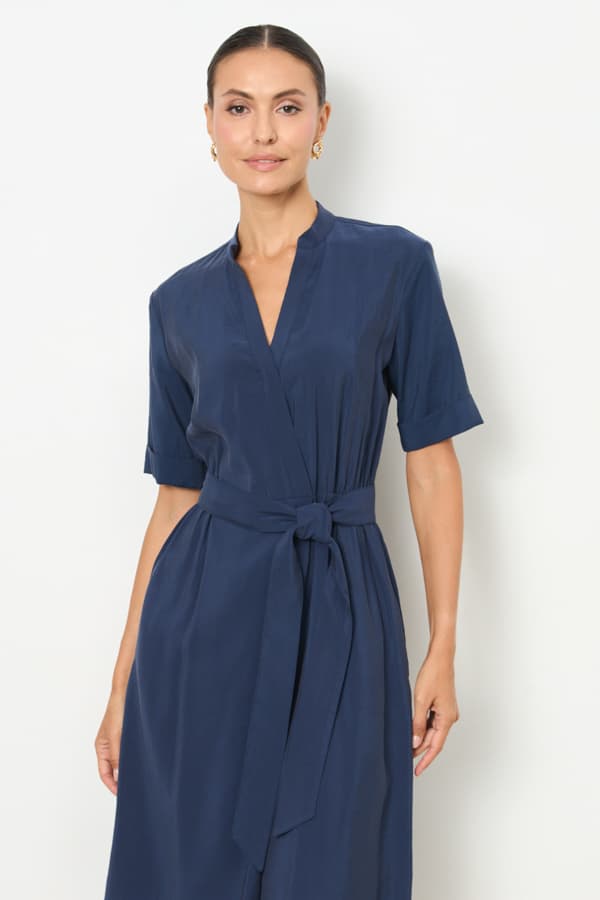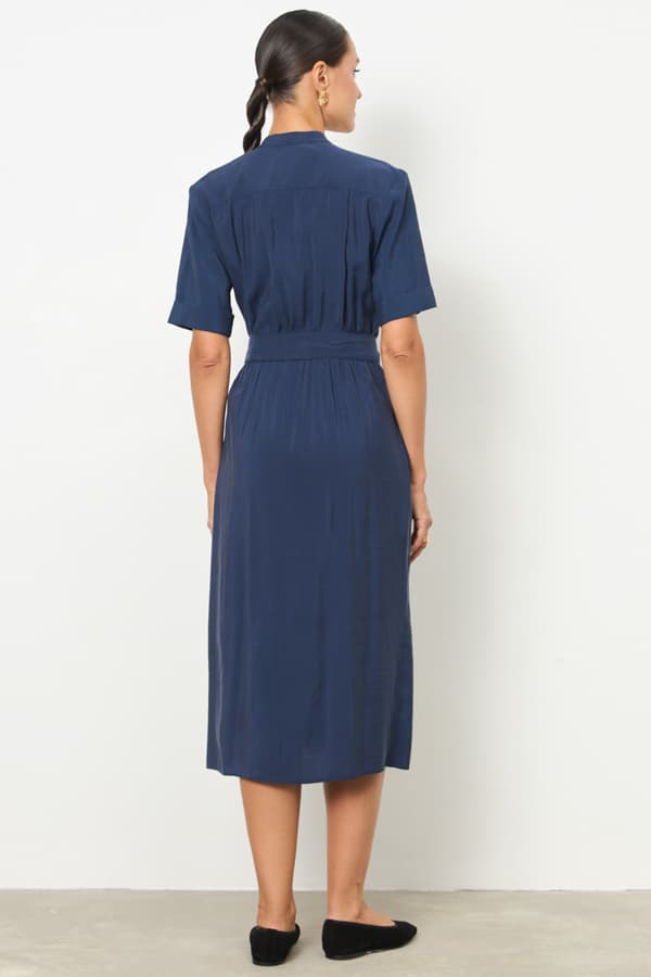 Платье из вискозной ткани с крэш-эффектом. Свободный силуэт. Изделие отрезное по линии талии с резинкой. Лиф платья с запахом, фиксируется на пуговицу для удобства. На передней части юбки выполнена складка, имитирующая запах, в боковых швах карманы. Линия горловины оформлена воротником-стойкой. Втачной длинный рукав. В комплекте пояс из основной ткани.