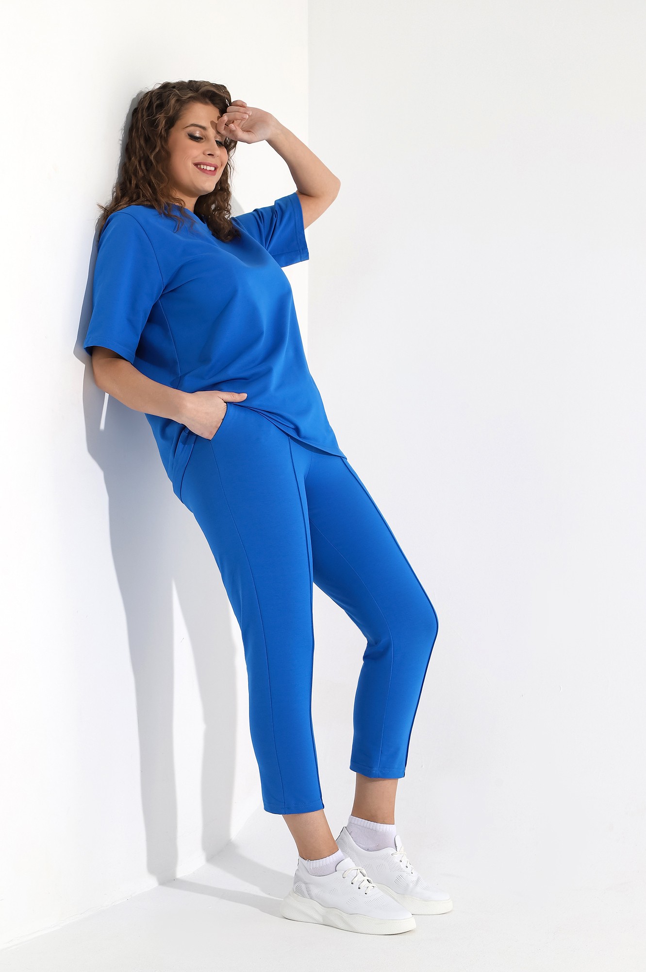 Костюм женский из гладкокрашеного трикотажного полотна футер-двунитка, состоящий из футболки и брюк. Футболка – классического покроя, с короткими втачными рукавами и горловиной овальной формы, обработанной втачной планкой. В нижней части полочки слева настрочен декоративный элемент прямоугольной формы.Брюки – длиной 7/8, слегка зауженные книзу, на притачном поясе с эластичной тесьмой внутри и карманами в боковых швах. Передние половины брюк застрочены по линиям центра вдоль на 0,3 см.