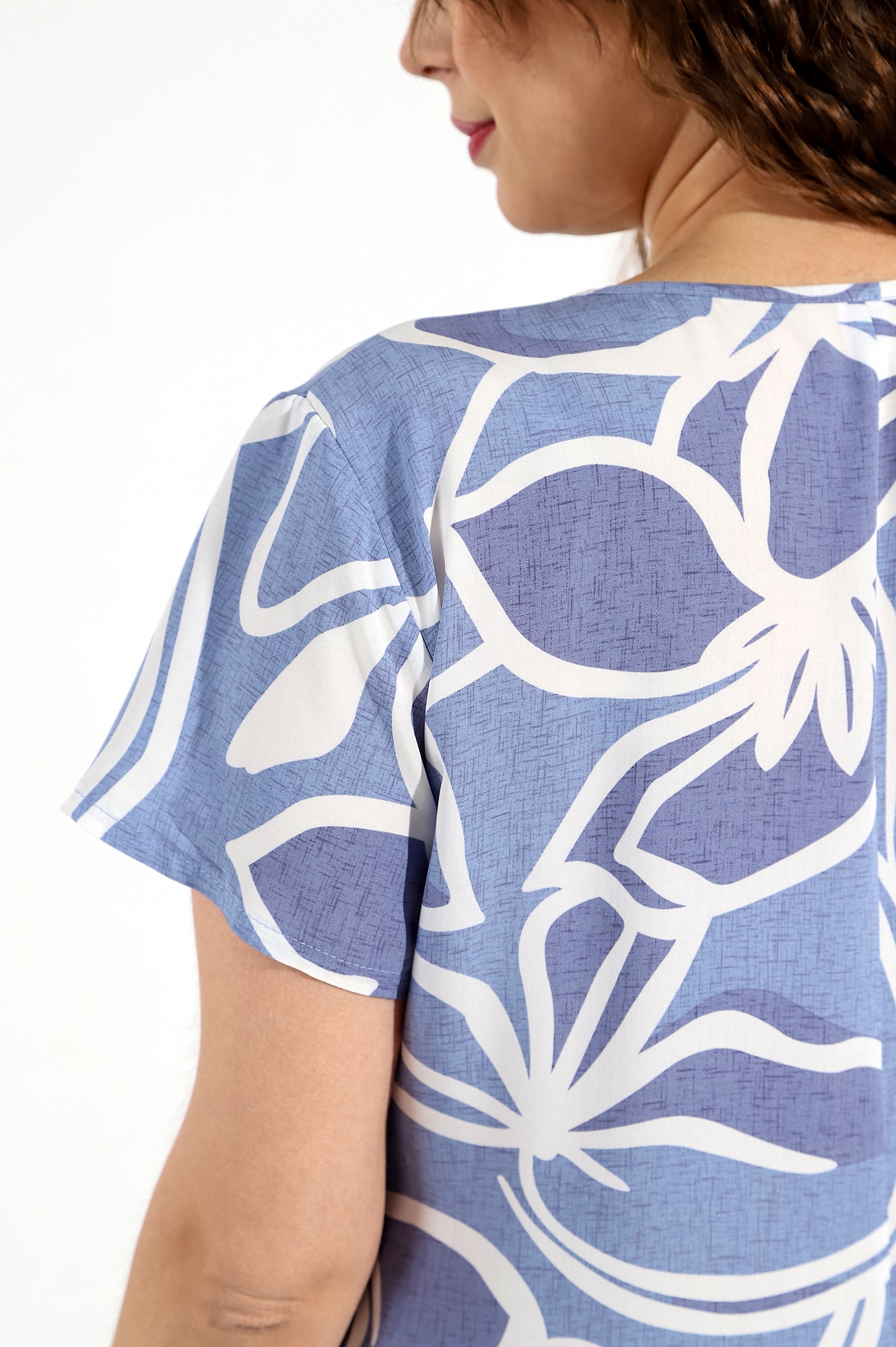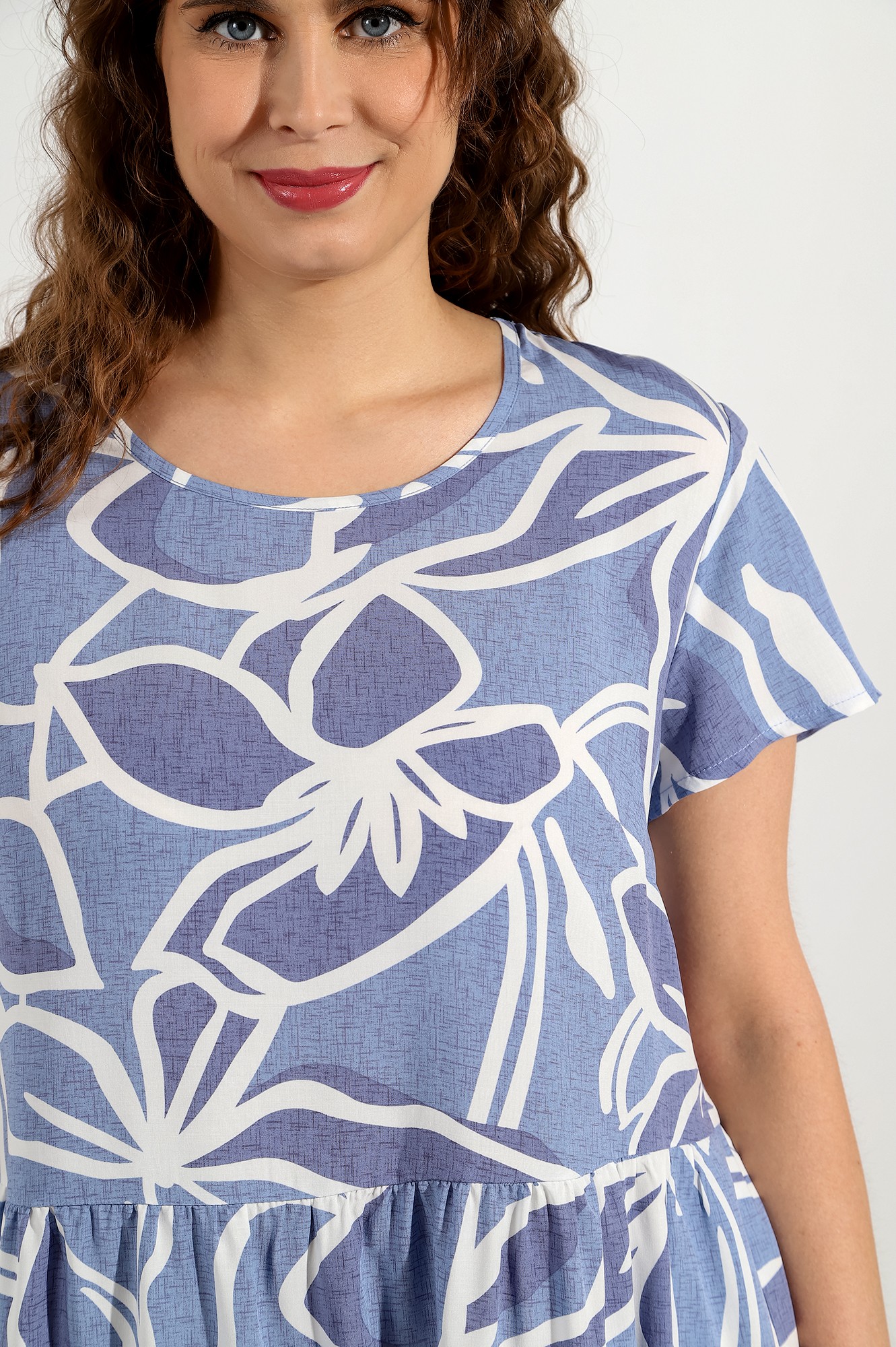 Платье из плательной штапельной ткани с набивным рисунком, свободного покроя, отрезное по линии талии, с короткими втачными рукавами и горловиной овальной формы, обработанной обтачкой. Полочка – с вытачками в области груди. Юбка – из двух ярусов, каждый из которых присборен по шву соединения с верхней деталью.