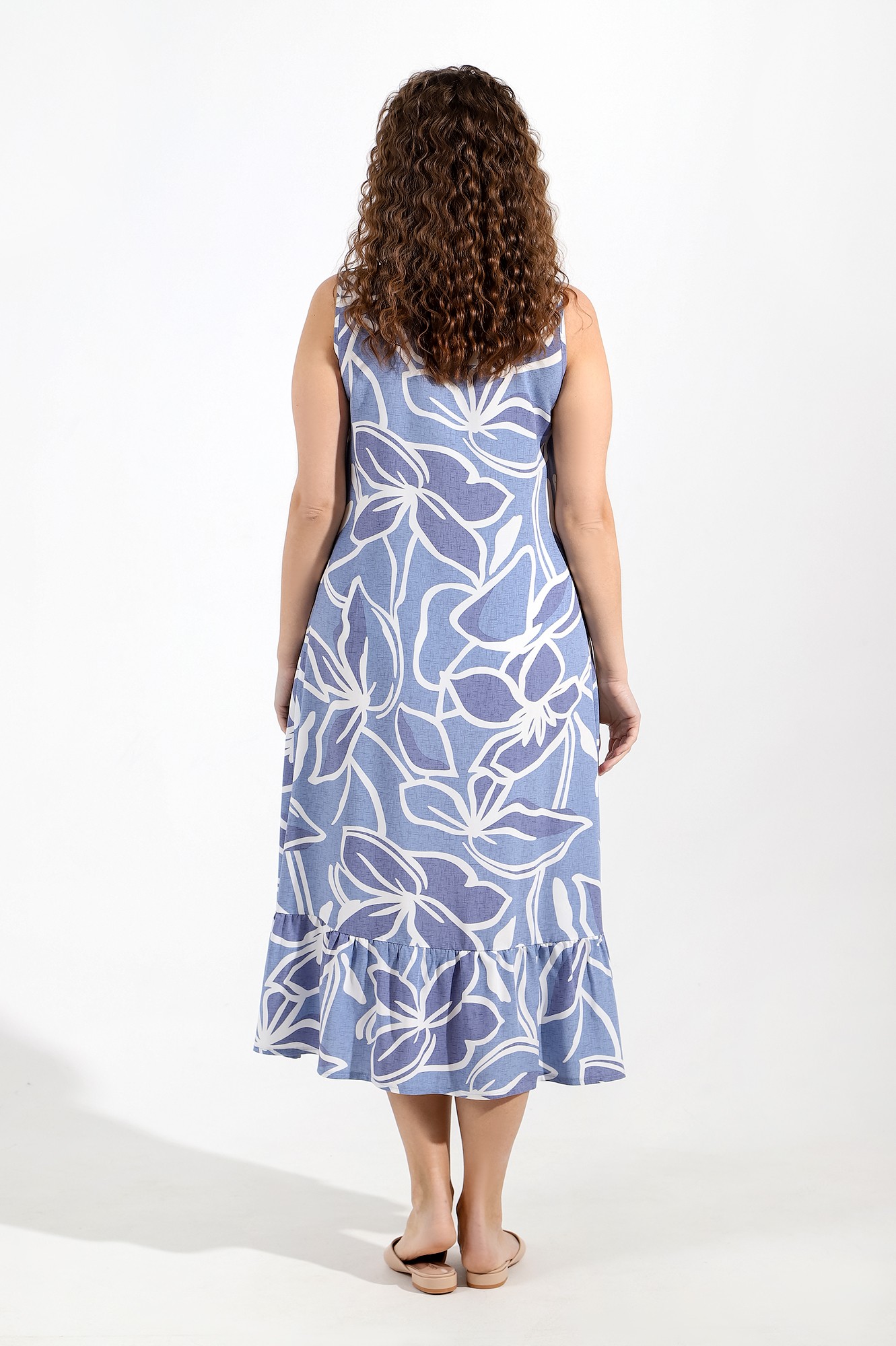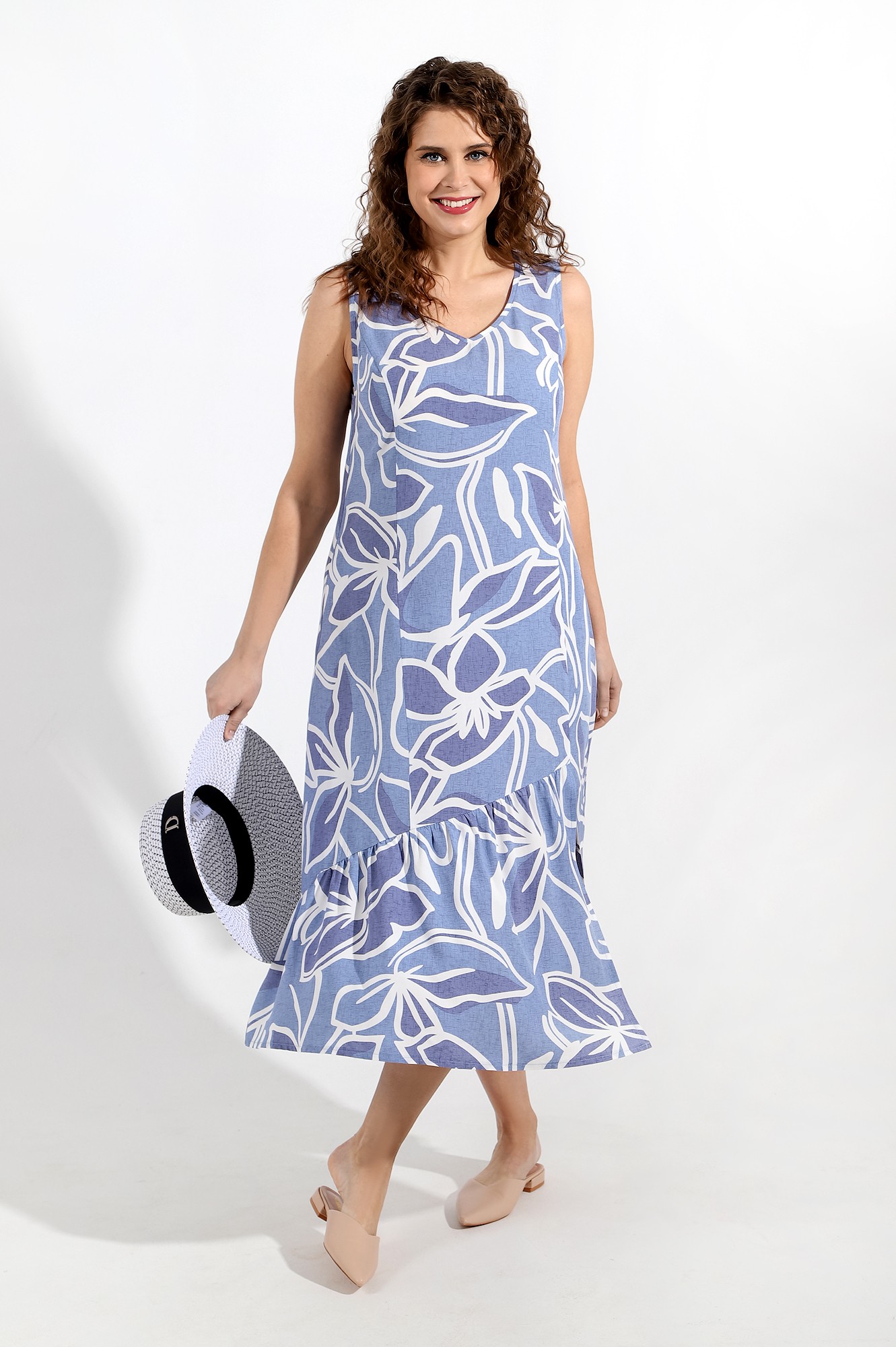 Сарафан женский из тканого штапельного полотна с набивным рисунком, удлиненное свободного силуэта, без рукавов, с рельефными швами, выходящими из пройм. По нижнему косому срезу притачная оборка и разрез в левом рельефном шве. Проймы и V-образная горловина окантованы основным материалом.