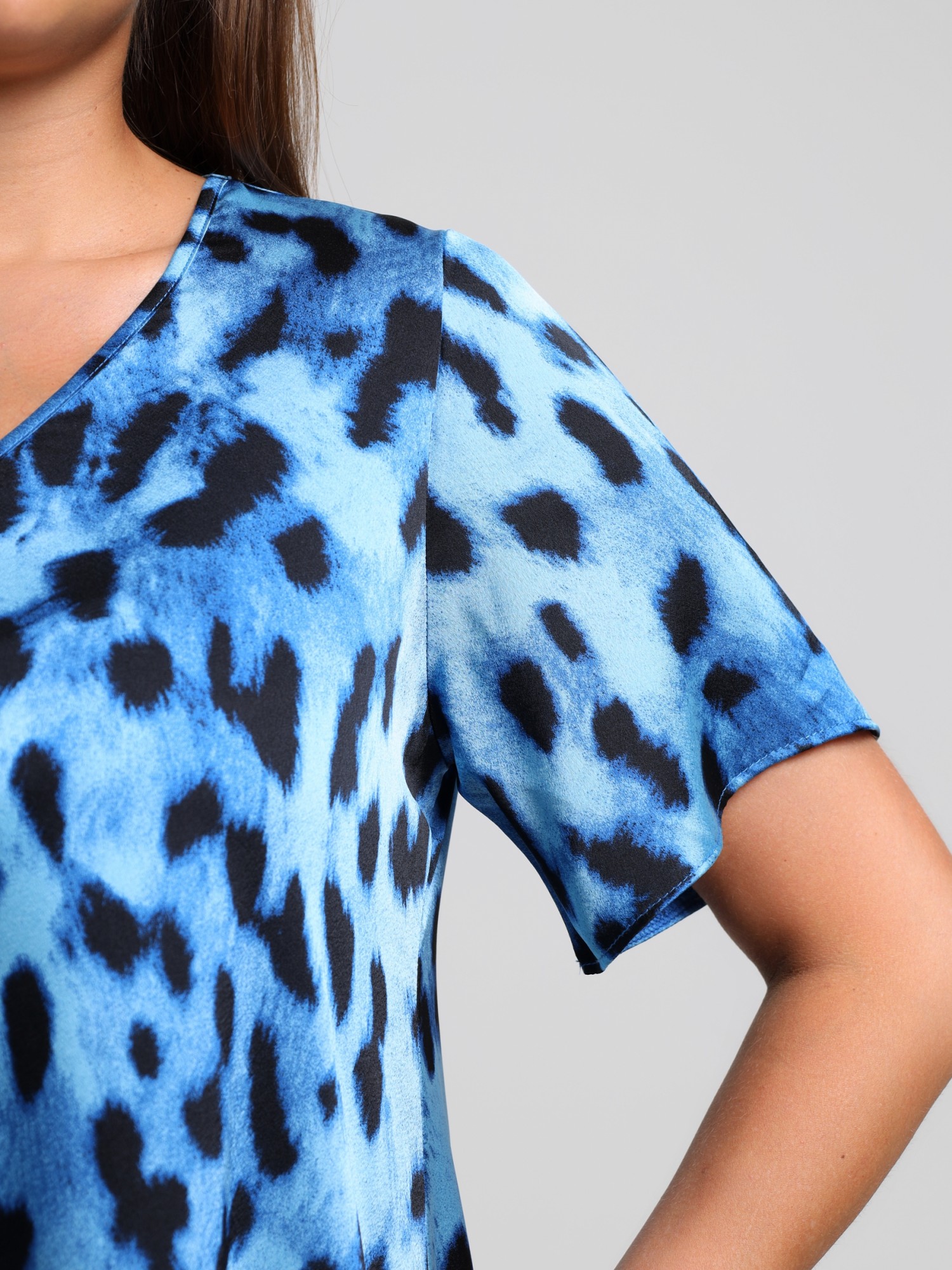 Платье женское из тканого полотна «искусственный шёлк полиэстер» с набивным рисунком, свободного покроя, удлиненное, по боковым швам расклешенное книзу, с V-образным вырезом горловины, окантованным основным материалом и короткими втачными рукавами.