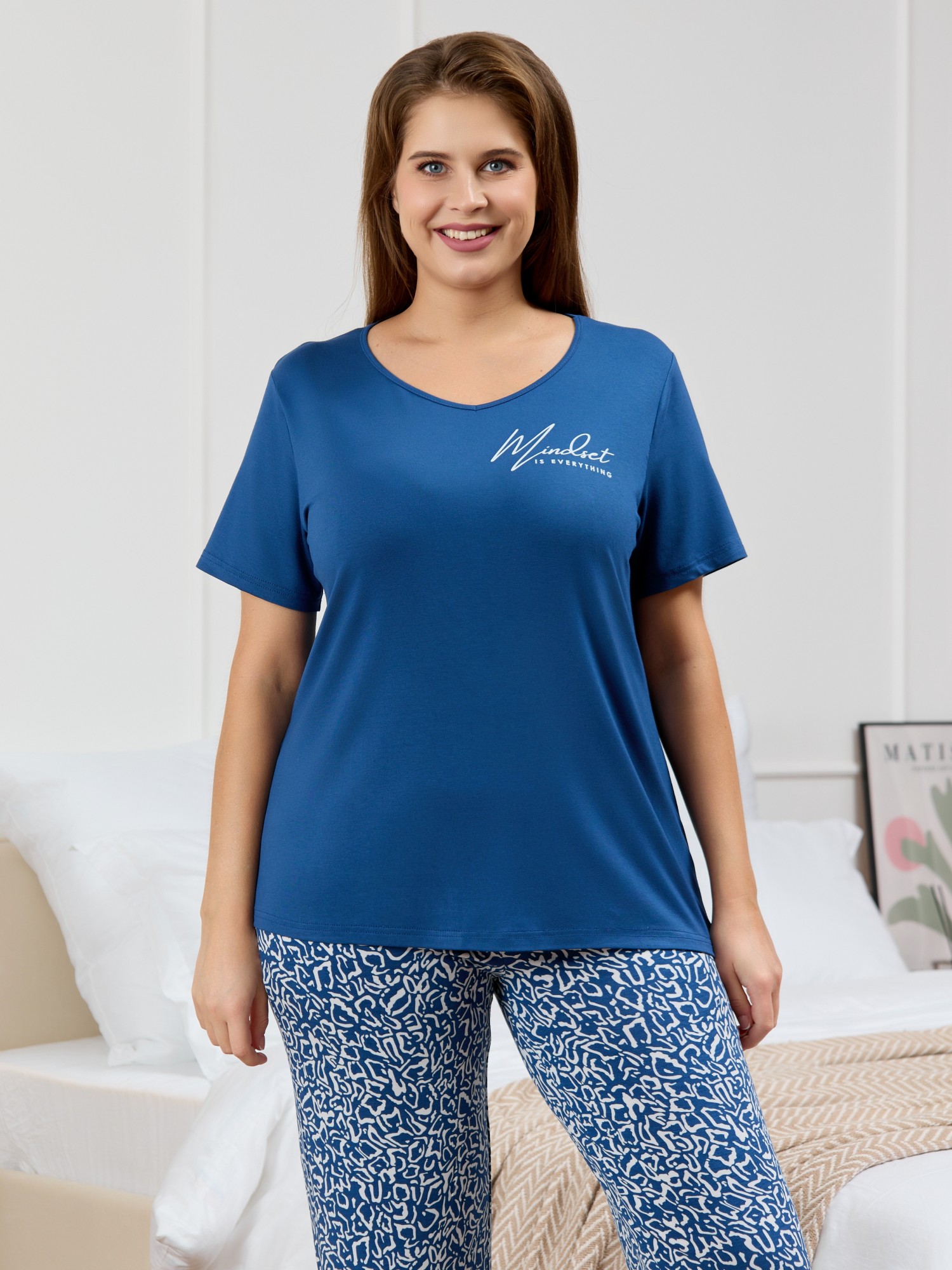 Костюм женский из трикотажного вискозного полотна в комбинации двух видов тканей: гладкокрашеной и с набивным рисунком, состоящий из футболки и брюк. Футболка – из гладкокрашеного полотна с короткими втачными рукавами, V-образной горловиной, окантованной основным материалом и принтом на полочке, выполненным в технике «шелкографии».Брюки — из полотна с набивным рисунком, прилегающего силуэта, с эластичной тесьмой по талии.
