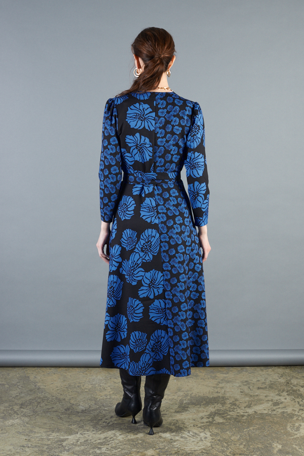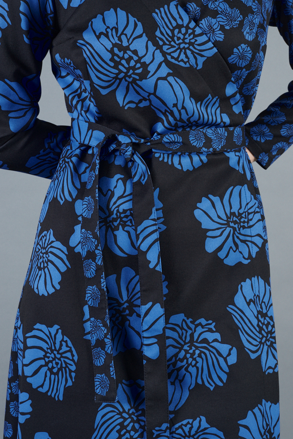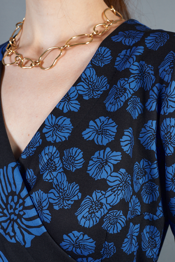 Платье с запахом фиксирующимся притачным поясом выполнено из плательной ткани. Отрезное в области талии. Лиф прилегающий. Юбка летящего силуэта. Укороченный втачной рукав со сборкой по окату.