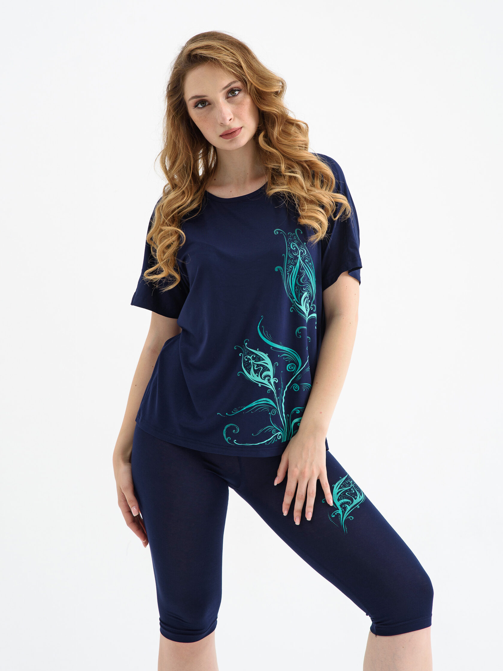 Футболка свободного силуэта из гладкокрашеного полотна (вискоза) с коротким цельнокроеным рукавом. Круглая горловина окантована бейкой из основного полотна. На полочке тематический принт. Низ изделия прямой, обработан швом «в подгибку». Бриджи прилегающего силуэта из гладкокрашеного полотна с цельнокроеным поясом на резинке.
