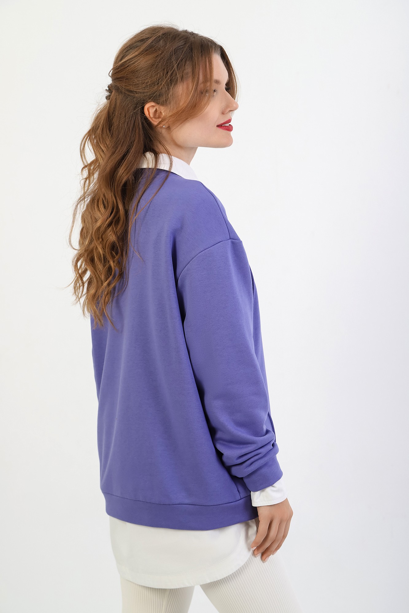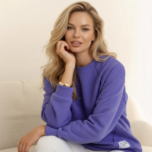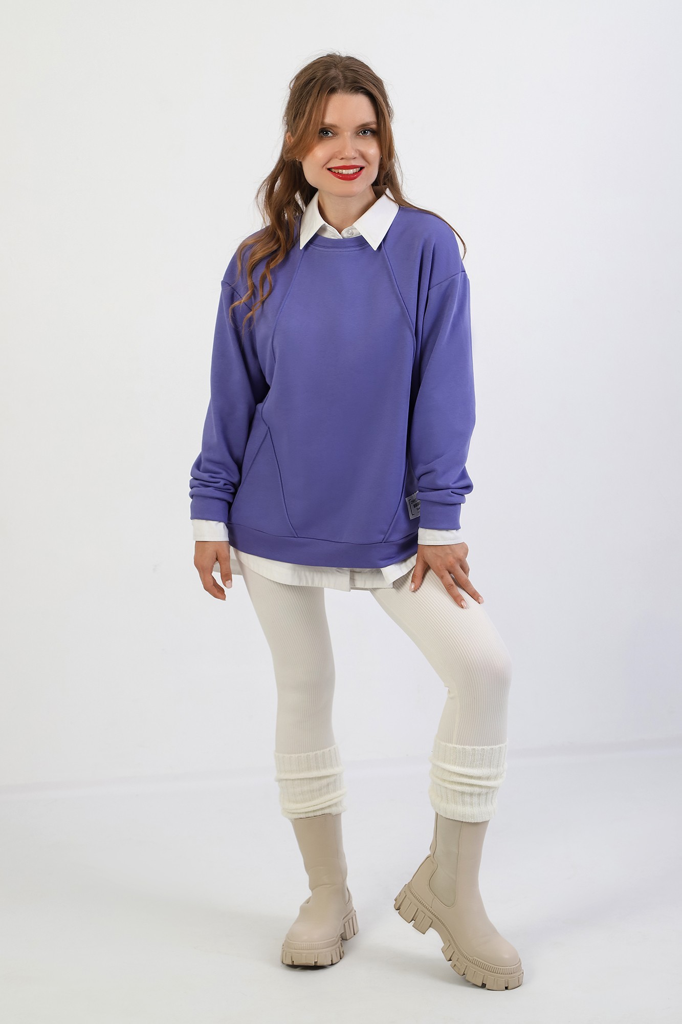 Джемпер молодежный из трикотажного полотна «футер» трехнитка-петля со спущенным плечом, длинными рукавами и горловиной овальной формы, обработанной втачной планкой. На полочке выполнены четыре ассиметричные отделочные строчки. Рукава – с манжетами, низ изделия на притачном поясе, с левой стороны настрочен декоративный элемент.