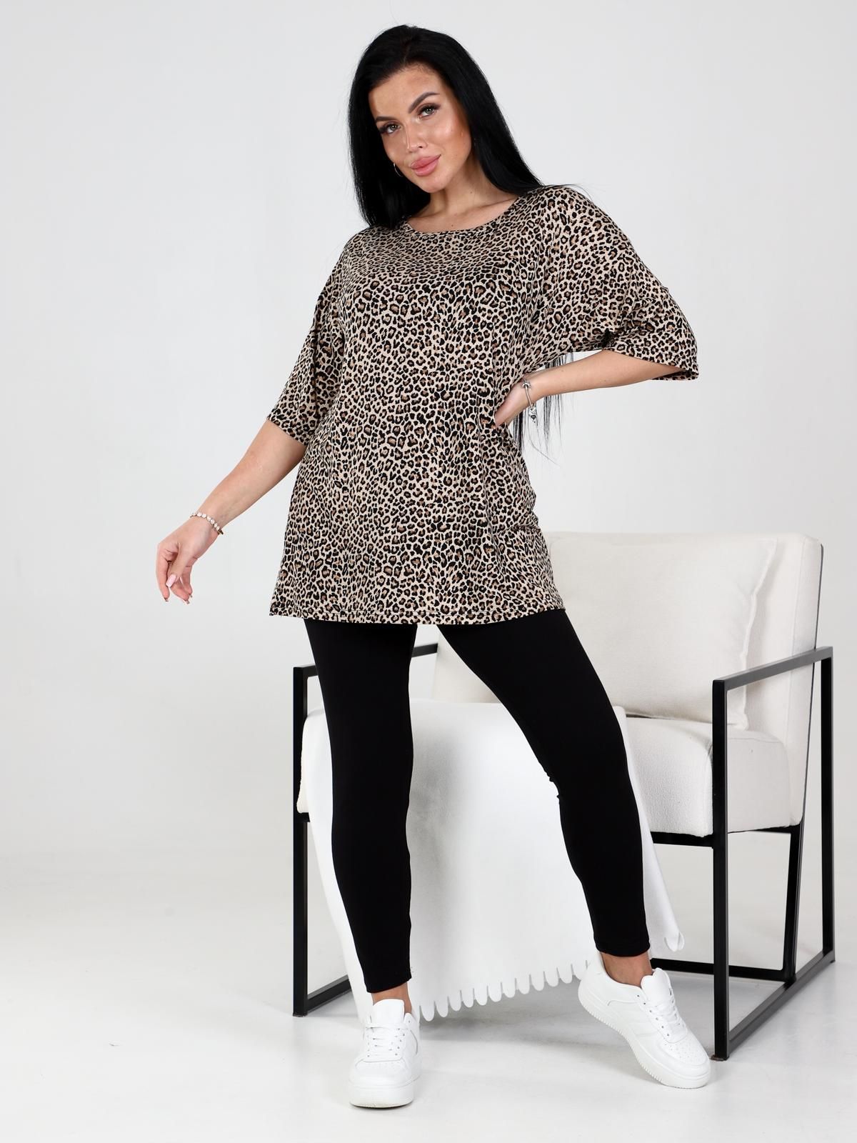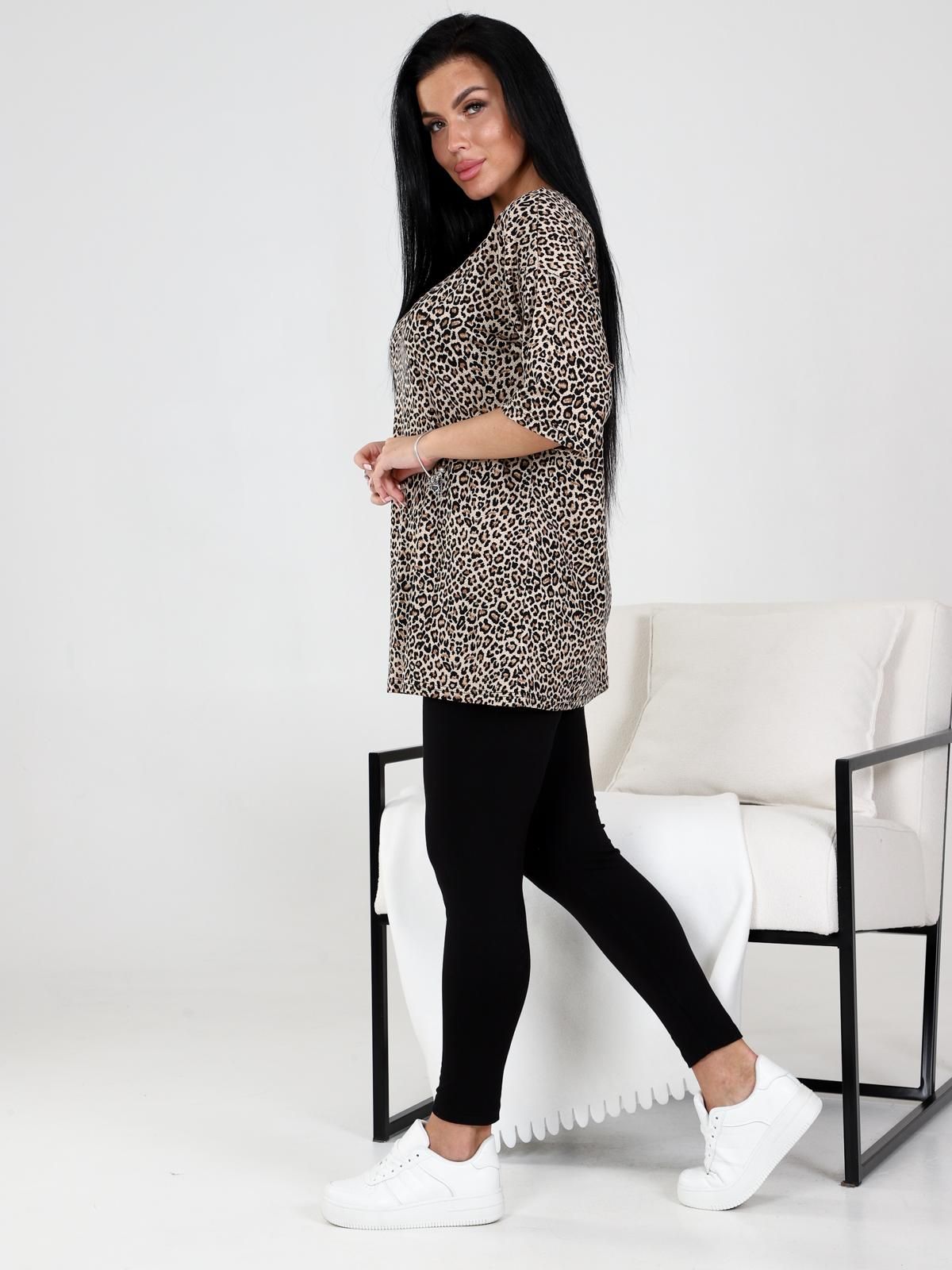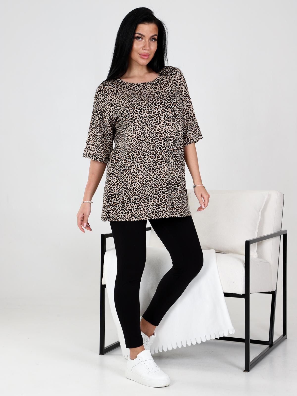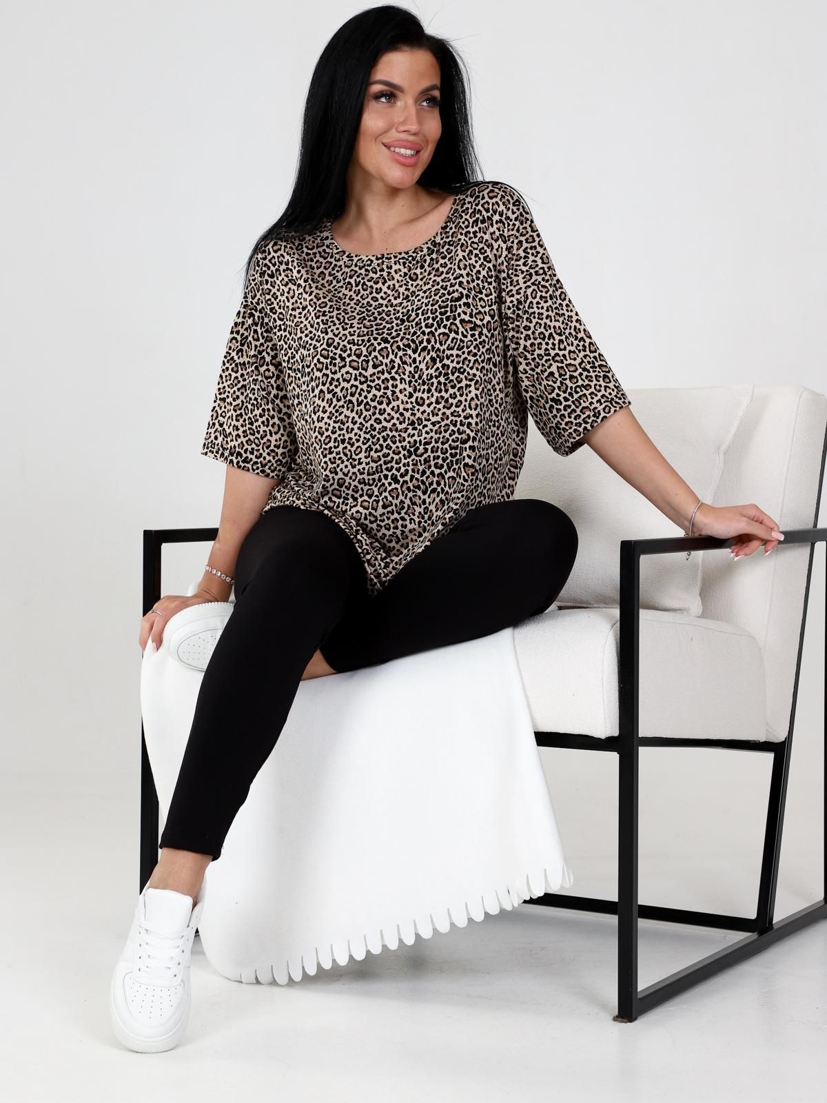 Костюм домашний женский из вискозы состоит из леггинсов и футболки. Леггинсы облегающего кроя. Футболка удлинённая свободного силуэта, вырез горловины обработан узкой планкой.