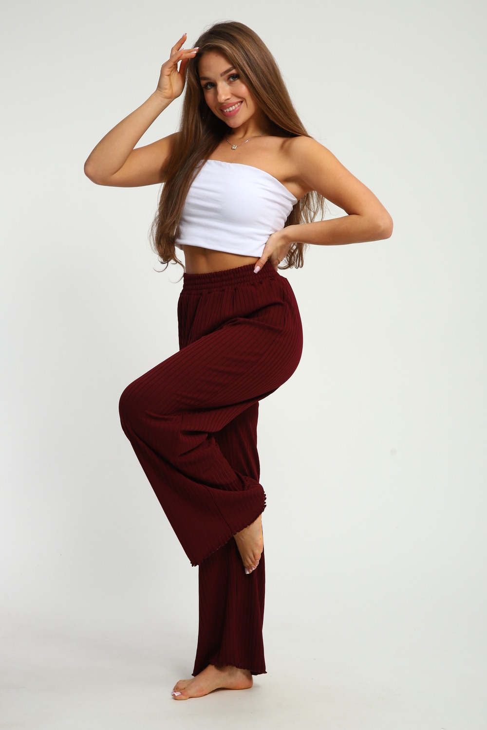 Такие брюки станут настоящим украшением гардероба, привлекая внимание окружающих своим необычным дизайном. Их можно сочетать с различными топами, создавая уникальные и стильные образы. Брюки палаццо из лапши это идеальный выбор для тех, кто хочет выделиться из толпы и продемонстрировать свою уникальность.. Цвет: черный;бордо;темно-коричневый; Материал: лапша; Состав: 75% вискоза, 10% эластан, 10% пэ, 5% спандекс.