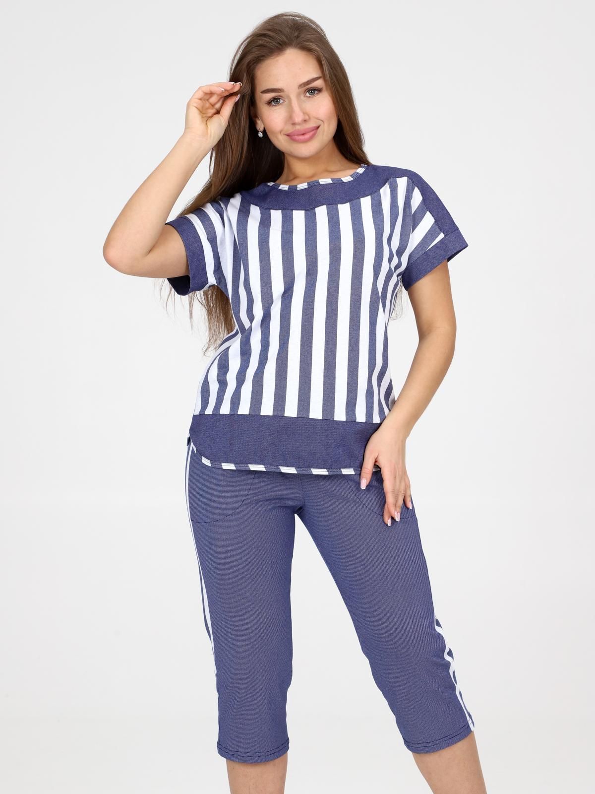 Женский костюм выполнен из трикотажного полотна "кулирка" двух контрастных расцветок. Футболка с цельнокроеным рукавом. На полочке кокетка по плечу и горловине. Горловина и фигурный низ окантованы. Бриджи с карманами. Пояс на эластичной тесьме. Сбоку лампасы из отделочной ткани.