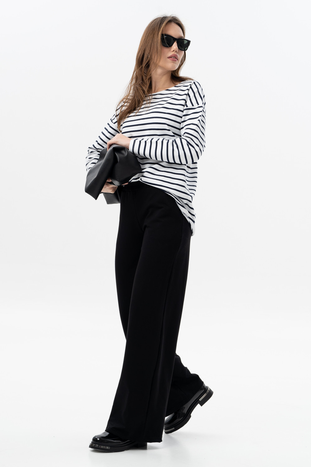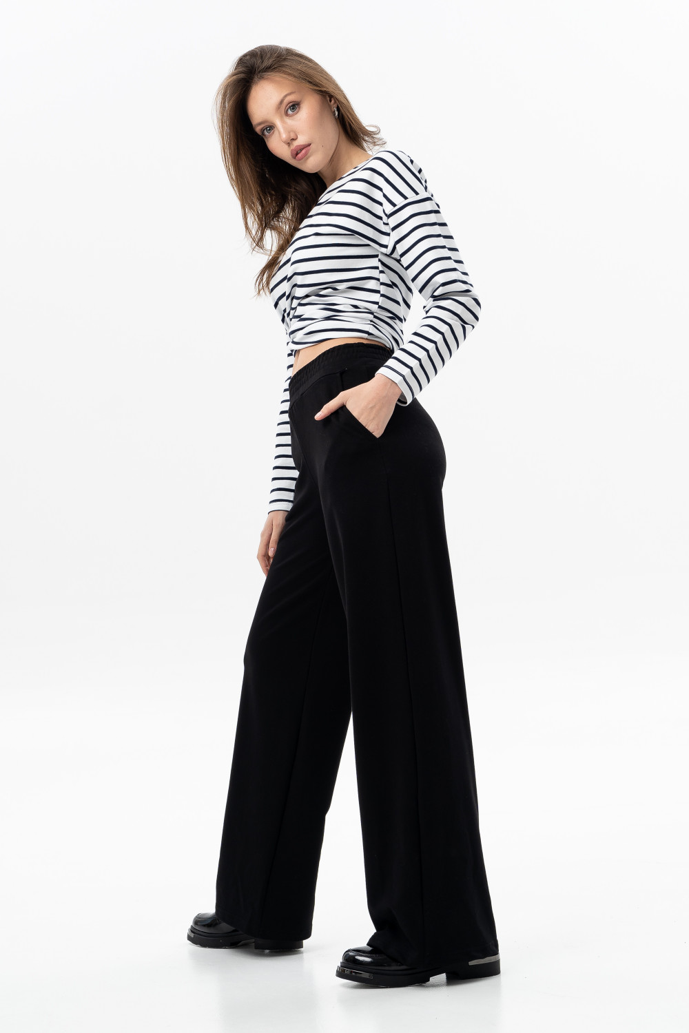 Стильные и модные брюки палаццо отличаются легкостью и комфортным прилеганием к телу. Мягкая резинка на талии обеспечивает идеальную посадку. Брюки прямые широкие с карманами в боковом шве выполнены из мягкого хлопкового футера, что придает ему стильный образ, а заодно выгодно подчеркивает фигуру. В комплекте с нашими джемперами из этой серии, футболкой или топом получается прекрасный костюм, который подходит как для дома, так и для прогулок и путешествий. Обращаем внимание, что цвет изделия может немного отличаться от оттенка, представленного на фотографиях. Рост модели на фото 176 см. размер одежды 44 Длина брюк по боковому шву 44 размер 108 см. 46 размер 108 см. 48 размер 108 см. 50 размер 108,5 см. 52 размер 108,5 см. 54 размер 109.5 см. х/б - 65 %; л. - 10 %; ПА - 25 %