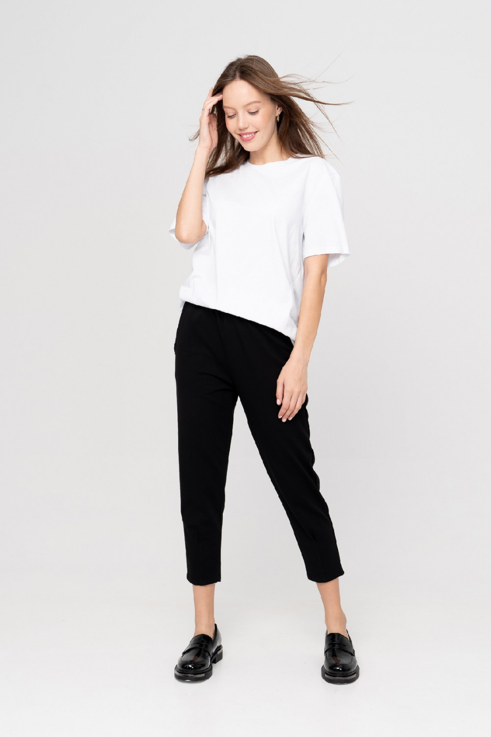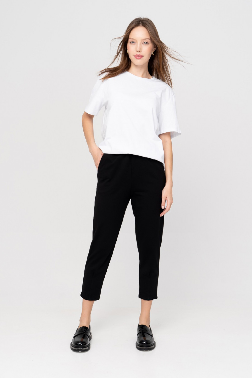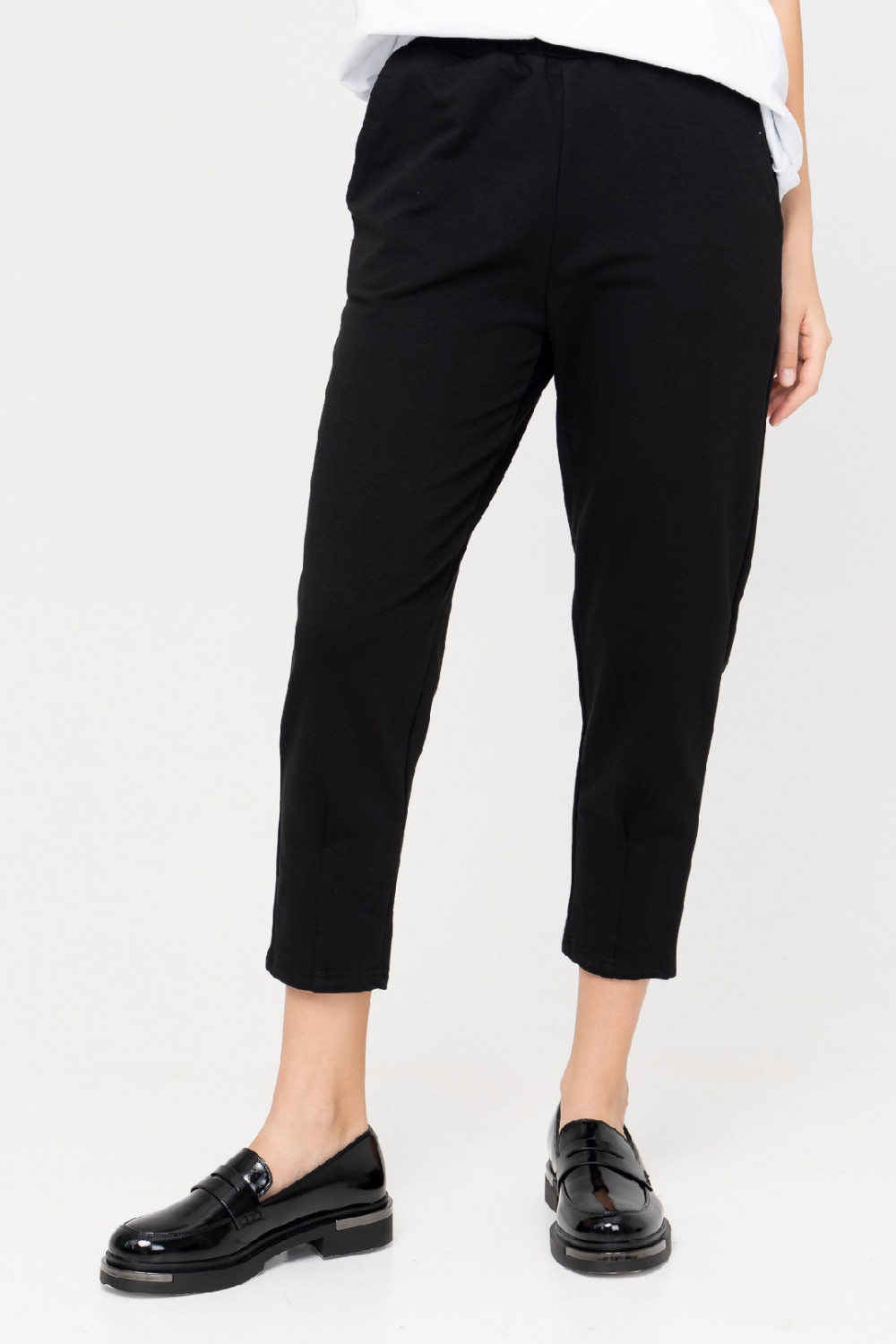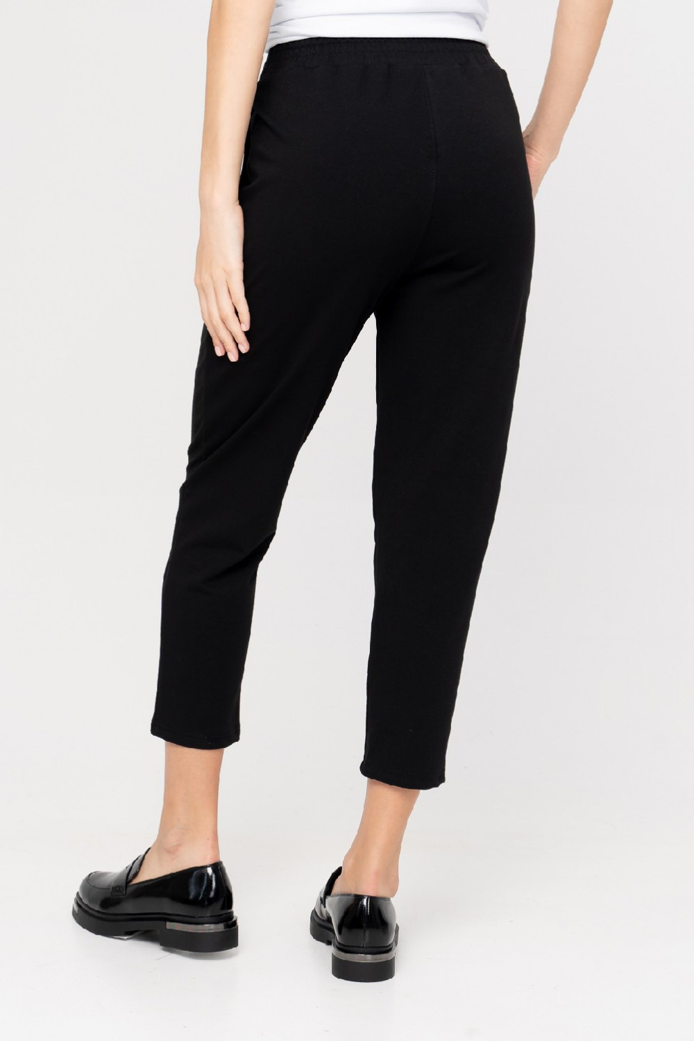 Стильные брюки длиной 7/8 отличаются легкостью и комфортным прилеганием к телу. Мягкая резинка на талии обеспечивает идеальную посадку. Брюки, зауженные к низу с карманами в боковом шве, выполнены из мягкого хлопкового футера, что придает ему стильный образ, а заодно выгодно подчеркивает фигуру. Декоративная складка на передней половинке спереди придают особый шик. Выглядит это очень эффектно и стильно. В комплекте с нашими джемперами, футболкой или топом получится прекрасный костюм, который подходит как для дома, так и для прогулок и путешествий. Рост модели на фотографии 176 см. размер одежды 44 Длина брюк по боковому шву 42 размер 91см. 44 размер 91см. 46 размер 91см. 48 размер 91см. 50 размер 93см. 52 размер 93см. 54 размер 94см. х/б - 65 %; л. - 10 %; ПА - 25 %
