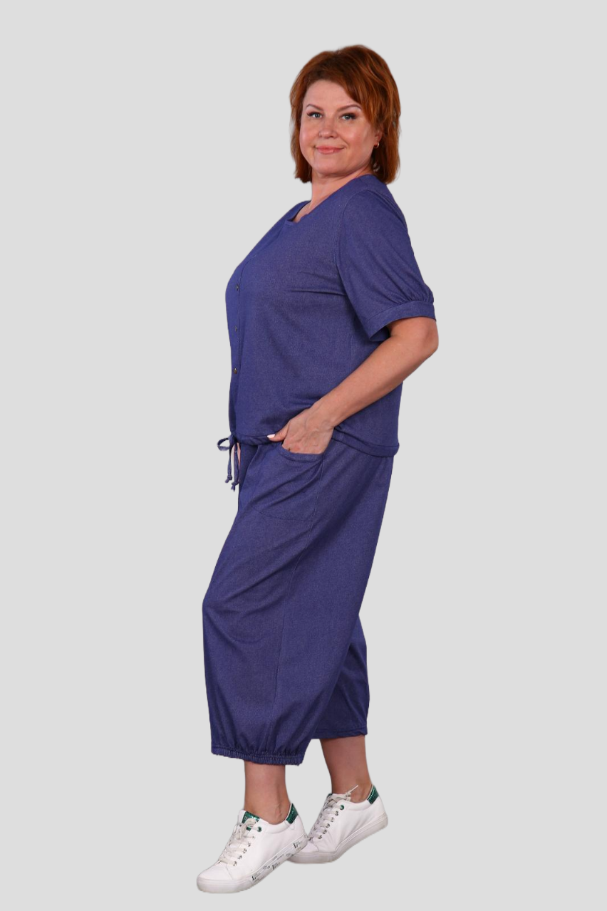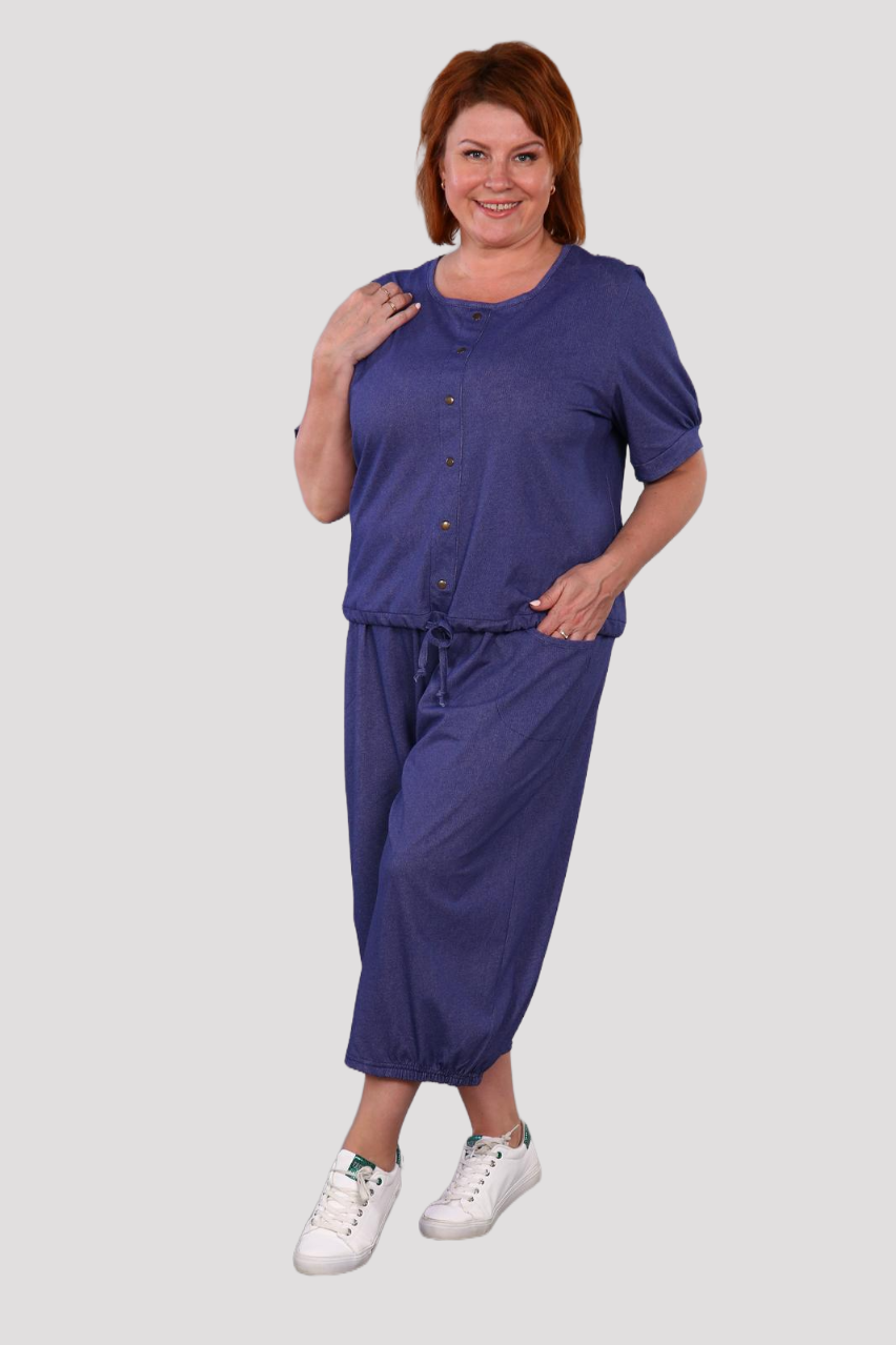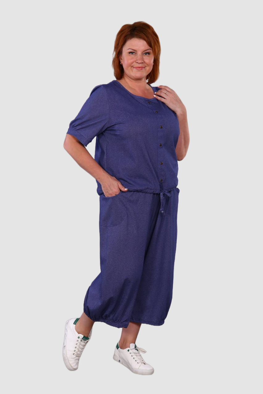 Современный и комфортный костюм из хлопкового трикотажа.  Модные в этом сезоне широкие брюки кюлоты, длиной до середины икры, с карманами, поясом на эластичной тесьме. Ширина брючин по низу присобрана на резинку, от середины передней части до середины задней части брюк. Футболка прямого покроя с рукавами на манжетах, по переду изделия ложная планка-застежка, с установленными по ней кнопками, низ футболки собран на кулиску. Костюм отличается мягкостью и легкостью. Костюм для девушек и женщин, любящих удобство и комфорт в одежде. Отлично подойдет для повседневного использования!