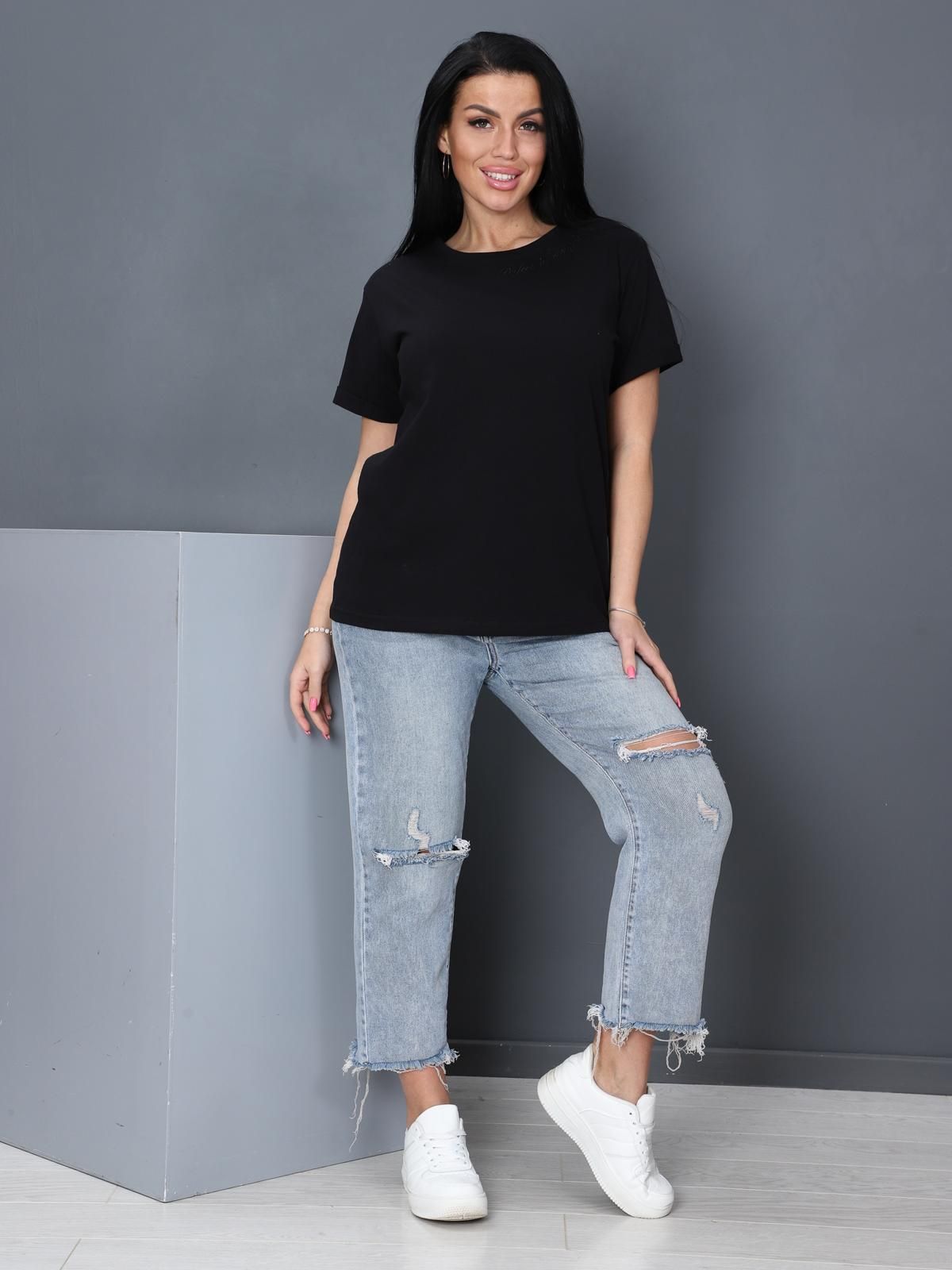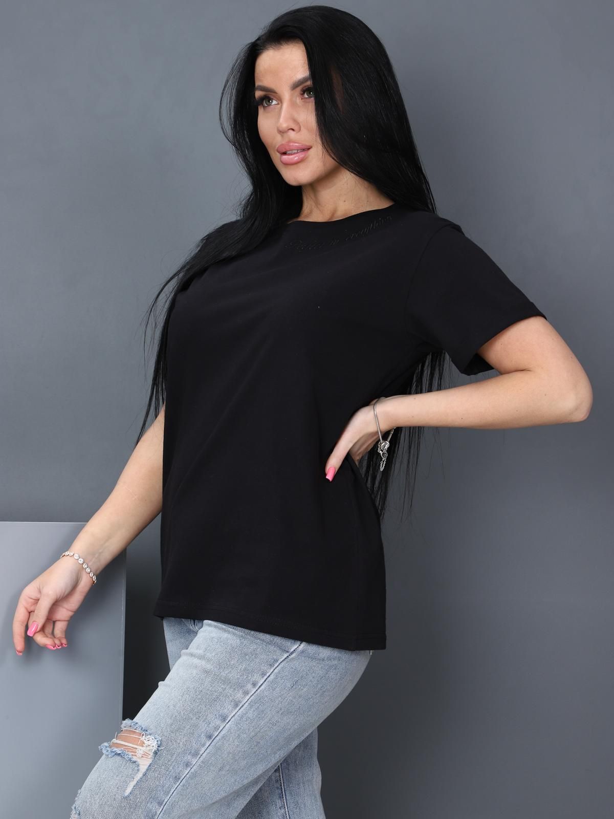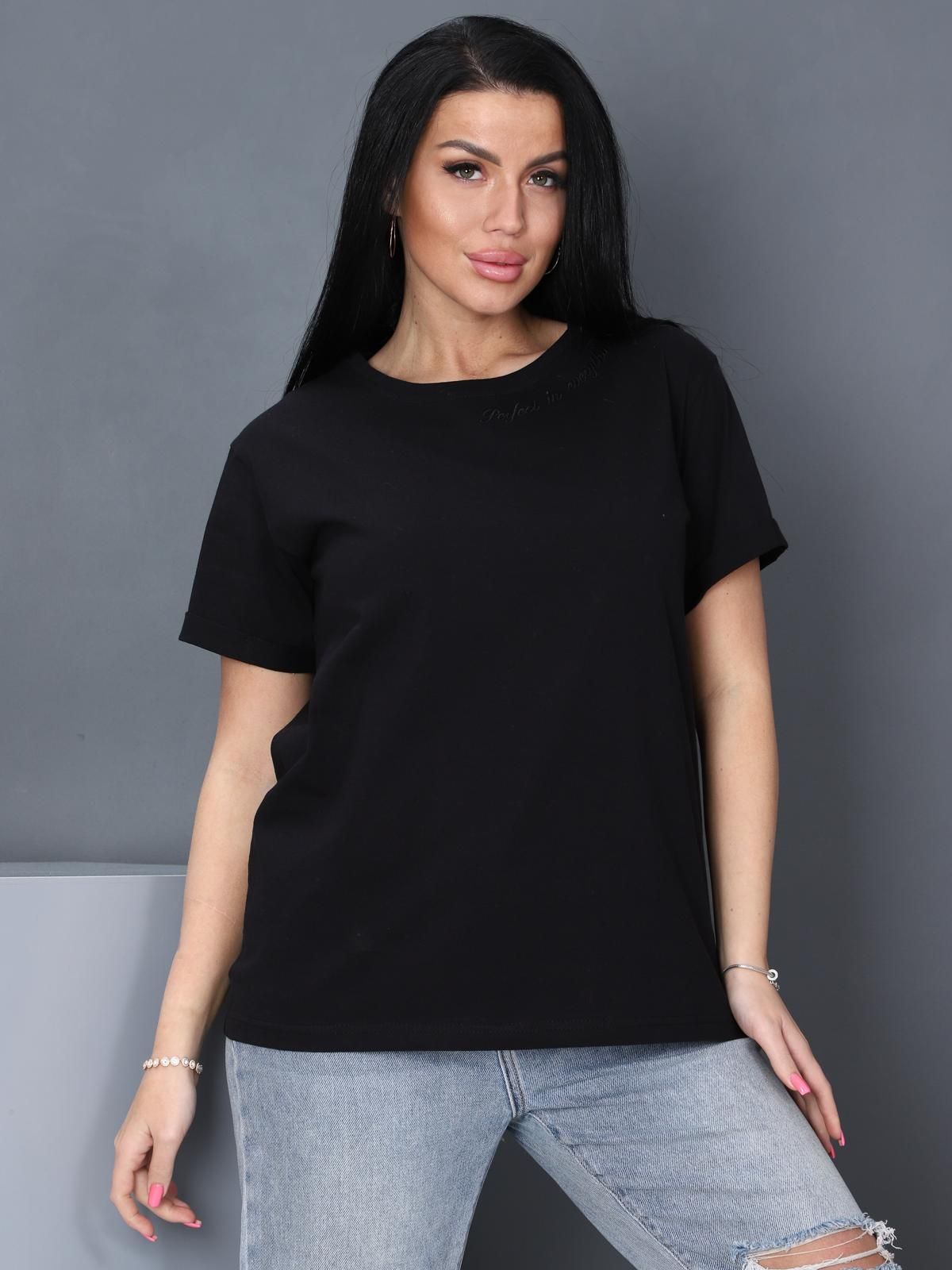 Футболка выполнена из хлопка, обтачка горловины из основной ткани, рукава с манжетом, около горловины выполнена вышивка.