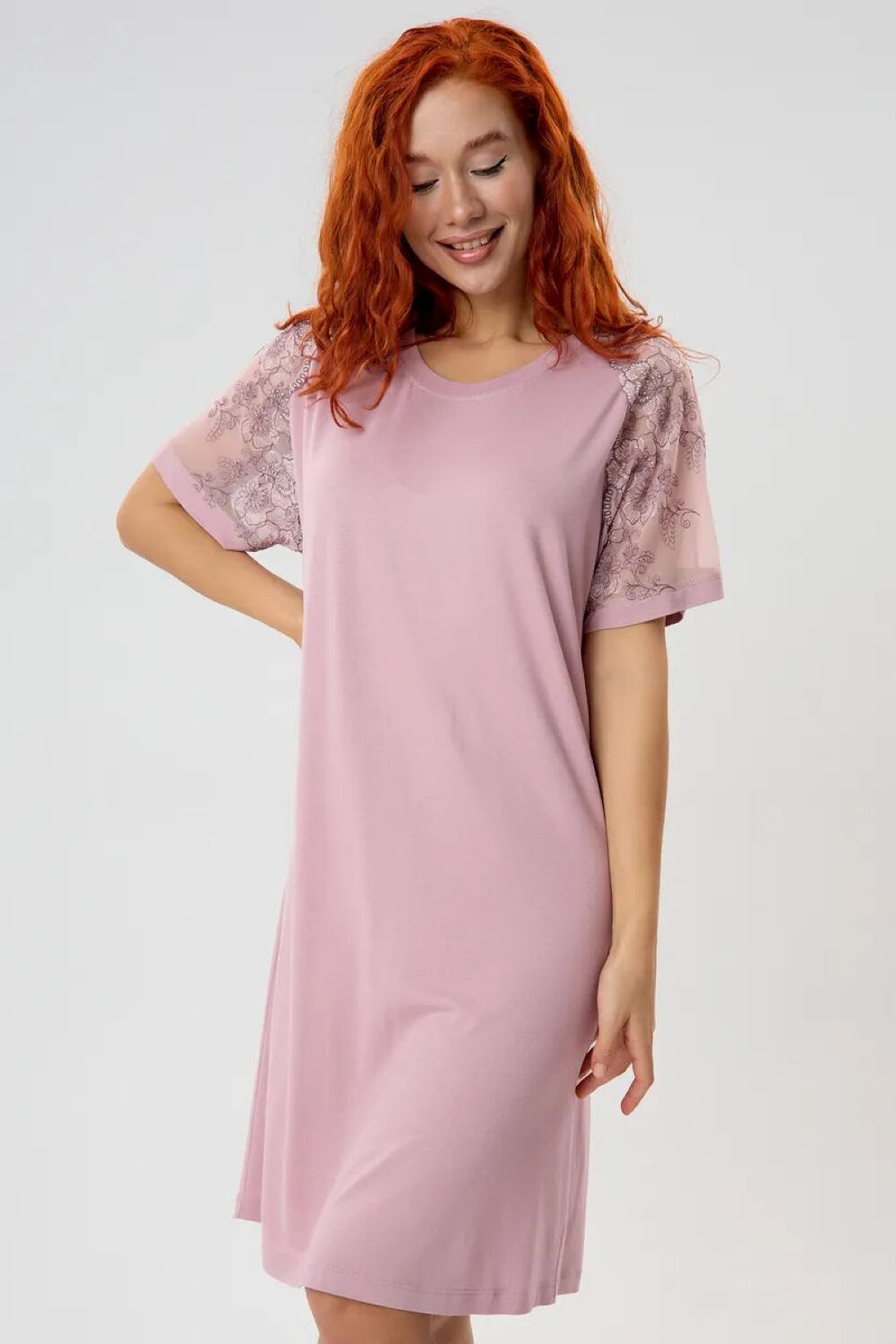Ночная сорочка из вискозы станет незаменимой частью вашего гардероба для комфортного и стильного отдыха. Длина изделия чуть ниже колена обеспечивает оптимальное удобство и свободу движений, а округлый вырез горловины придает образу мягкость и женственность. Особое внимание привлекают рукава реглан, выполненные из эффектного кружева на сетке, добавляющие сорочке нотку романтичности и изящества. Свободный крой позволяет носить сорочку как будущим мамам, так и всем, кто ценит комфорт в сочетании с элегантностью. Большой размерный ряд позволит каждой женщине найти идеальный вариант, а трикотажная текстура ткани гарантирует идеальную посадку, благодаря своей способности хорошо тянуться и адаптироваться к особенностям фигуры.